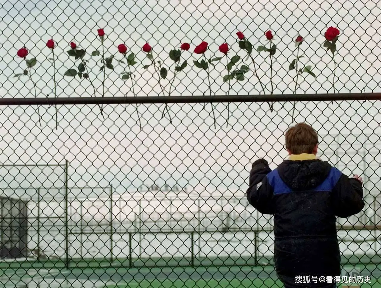 9. 24 เมษายน พ.ศ. 2542 วันเสาร์ เด็กชายคนหนึ่งมองลอดรั้วที่สนามเทนนิสโรงเรียนมัธยมโคลัมไบน์ กุหลาบ 13 ดอกบนรั้ว เพื่อรำลึกถึงผู้เสียชีวิต 13 รายที่โรงเรียนเมื่อวันอังคาร โดยนักเรียนติดอาวุธ 2 คน
