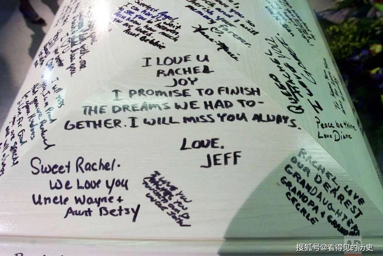 10. 24 เมษายน พ.ศ. 2542 โลงศพที่มีราเชล จอย สก็อตต์ เหยื่อของการยิงโรงเรียนมัธยมโคลัมไบน์ ถูกวางไว้ที่ศูนย์คริสเตียนทรินิตี้ มีลายเซ็นของครอบครัวด้วย ในที่ประชุมที่โศกเศร้า มีคนลงนามในโลงศพมากขึ้นเรื่อยๆ