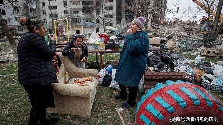 5. วันที่ 8 เมษายน, ผู้คนในโบโรเดียนกากินอาหารฟรีใกล้บ้านของพวกเขา บ้านหายไป ชีวิตยังต้องดำเนินต่อไป ภาพถ่ายโดย Reuters Gleb Garanich