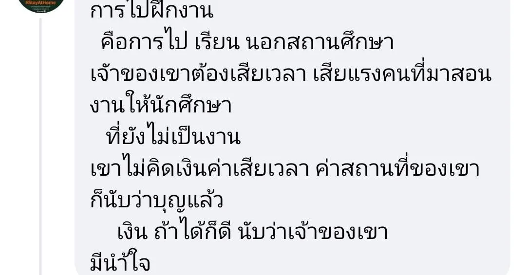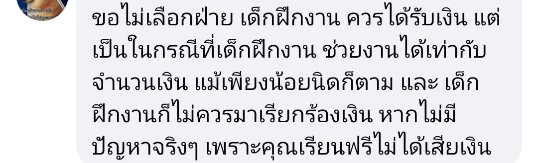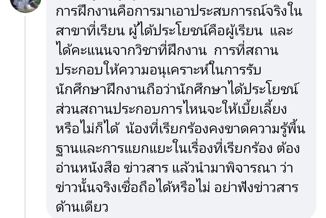 ถ้าเกิดการเรียกร้องให้จ่ายเงิน ผมว่าองค์กรต่างๆคงถอยห่างเด็กฝึกงาน เพราะเขาถ้าจะจ่ายเงินจ้างคนเป็นงานดีกว่า...จ้างเด็กมาขอเรียนรู้งาน หรือขอวิชาในการทำงานจริงๆจากองค์กร....