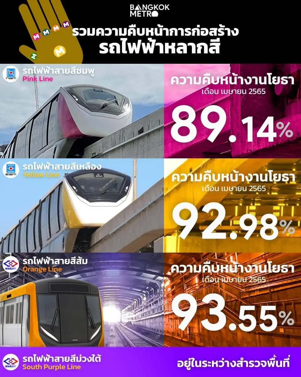 ปัจจุบันก็มีความคืบหน้าไปเยอะมากแล้ว ซึ่ง 2 เส้นทางที่มีกำหนดจะเปิดใช้ภายในปีนี้คือสายสีเหลืองและสีชมพู