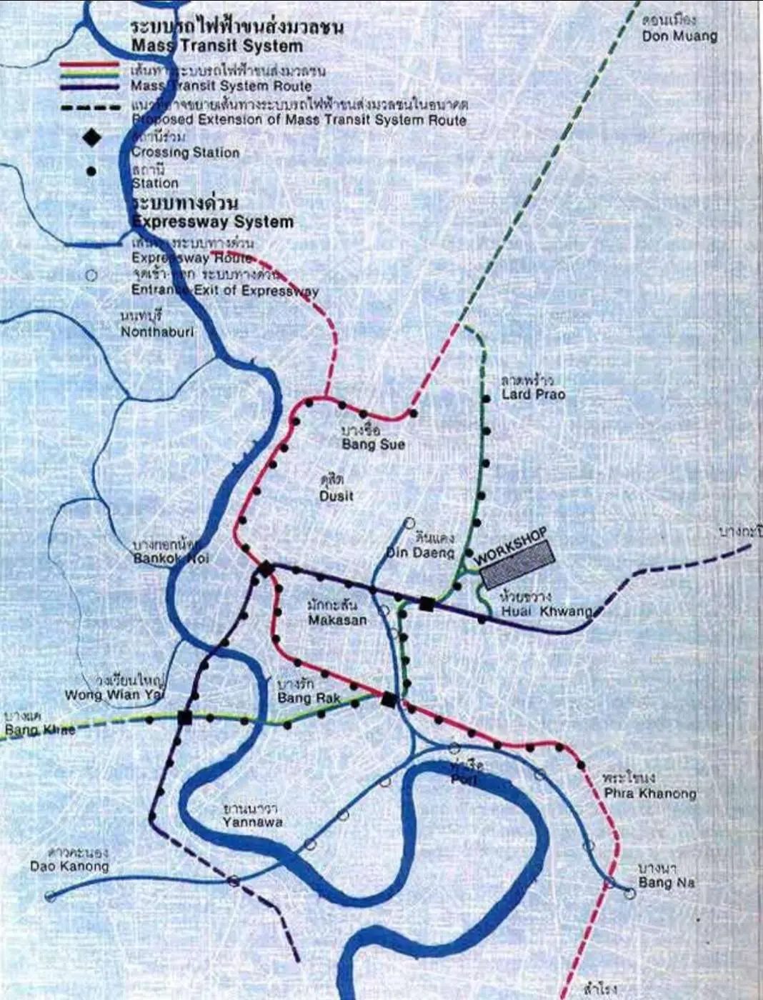 - สายสะพานพุทธ จากดาวคะนอง-สะพานพุทธ-มักกะสัน ระยะทาง 16 กิโลเมตร มีการก่อสร้างสะพานข้ามแม่น้ำเจ้าพระยาไปแล้ว พร้อมกับการก่อสร้างสะพานพระปกเกล้า อยู่กึ่งกลางระหว่างทั้งสองฝั่ง หรือที่เรียกสะพานตรงนี้ว่าสะพานด้วน ปัจจุบันกำลังใช้สะพานด้วนตรงนี้ให้กลายมาเป็นพระปกเกล้าสกายปาร์ค