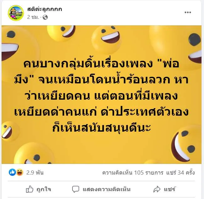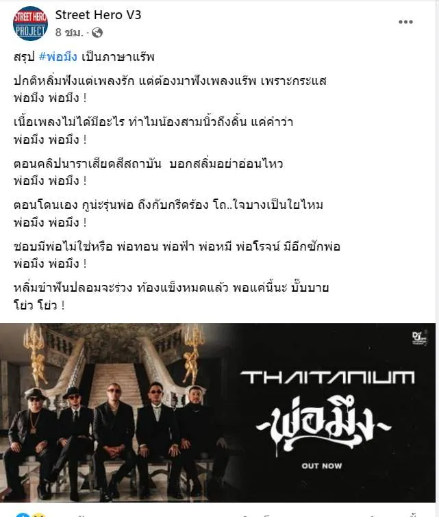 อย่างไรก็ตาม เพจเฟซบุ๊ก Street Hero V3 โพสต์ข้อความว่า สรุป #พ่อมึง เป็นภาษาแร๊พ ปกติหลิ่มฟังแต่เพลงรัก แต่ต้องมาฟังเพลงแร๊พ เพราะกระแส พ่อมึง พ่อมึง! เนื้อเพลงไม่ได้มีอะไร ทำไมน้องสามนิ้วถึงดิ้น แค่คำว่า พ่อมึง พ่อมึง !