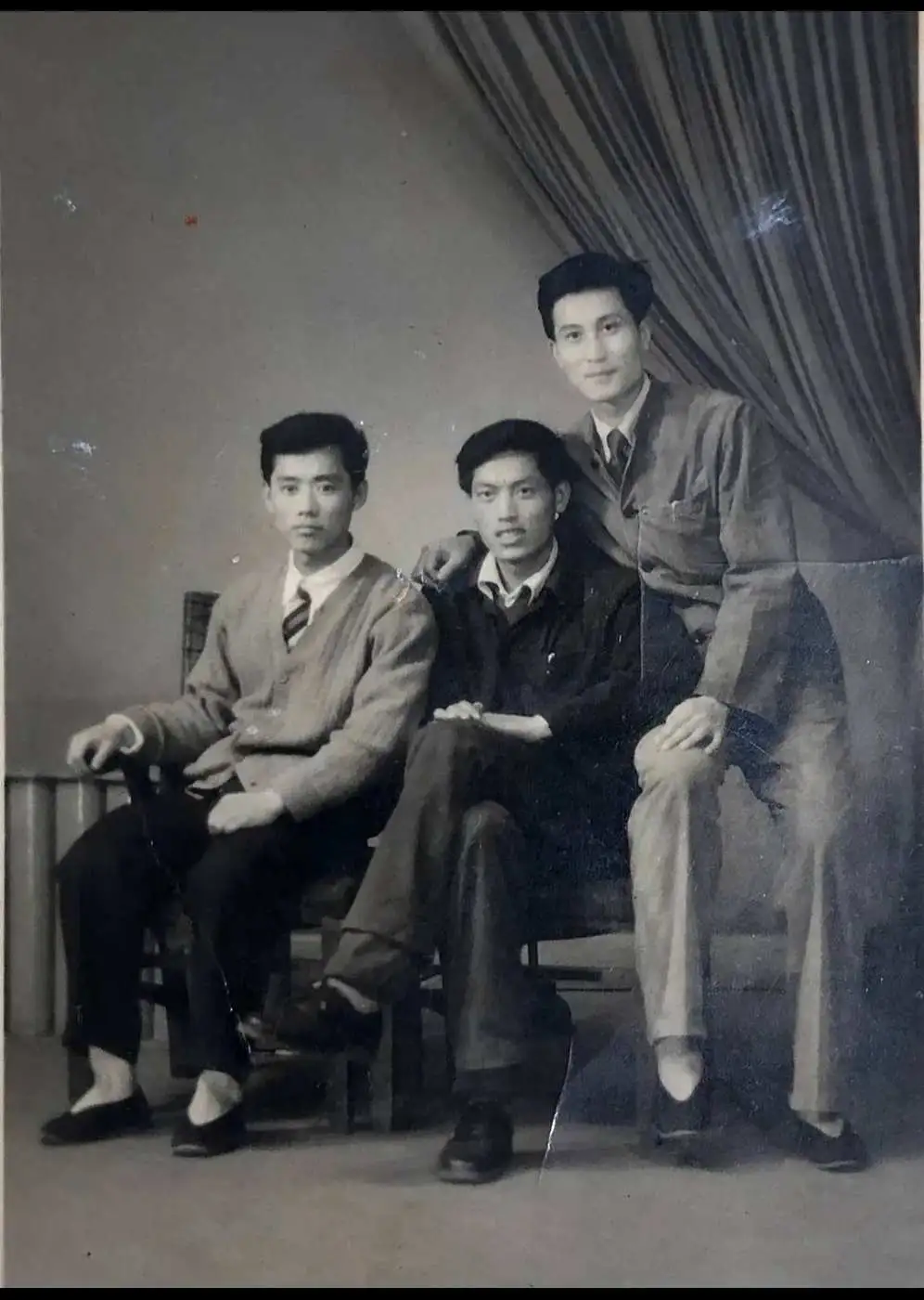 3. ถ่ายรูปหมู่สามพี่น้อง ในภาพ ชายหนุ่มสามคนที่มีทรงผมเก๋ไก๋ สวมใส่เสื้อผ้าที่ดูดี มองตรงเข้าไปในกล้องด้วยความมั่นใจ และมีรอยยิ้ม หล่อมาก.