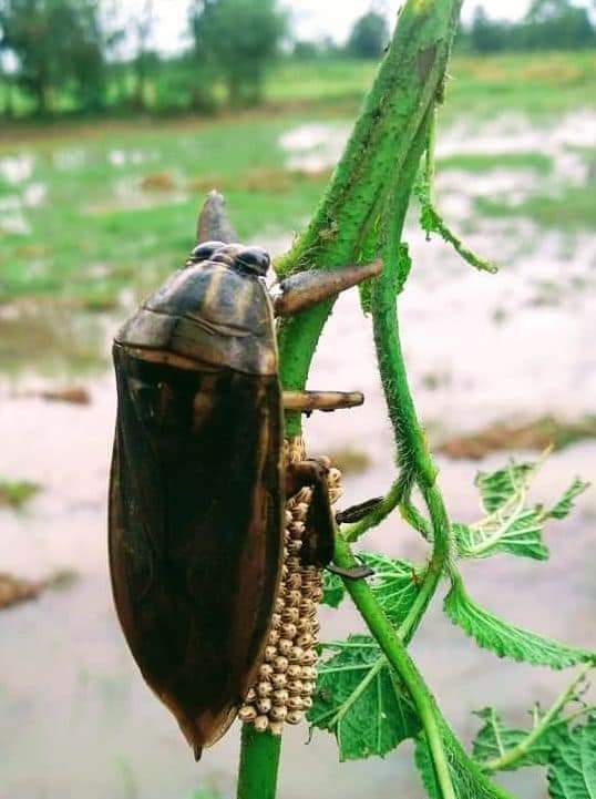 ตามต้นหญ้า พุ่มไม้ปริ่มน้ำตามท้องนา มักจะพบเห็น ไข่แมงดา โผล่เหนือน้ำว่าแล้ว ก็ หา งมแมงดา เพื่อทำแจ่วแมงดากินเป็นอาหาร คนอีสานกับแมลง มีความสัมพันธ์ในการบริโภคค่อนข้างมาก และเป็นอาหารที่หาได้แทบทุกฤดู