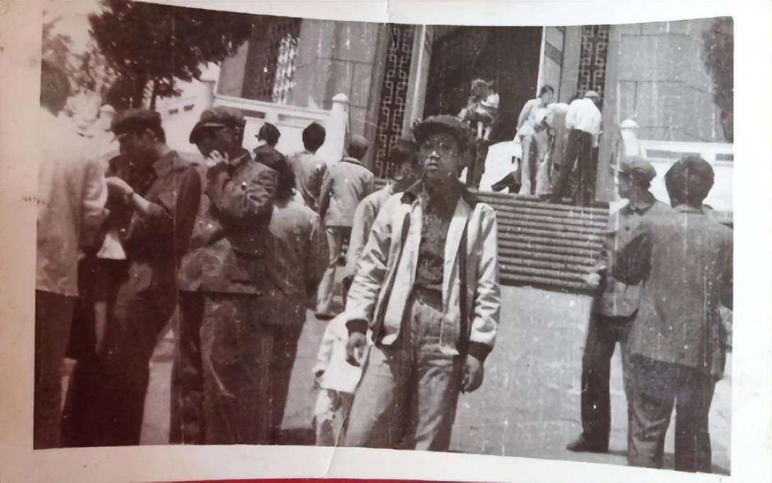 3. นี่เป็นภาพเก่าที่ถ่ายในปี 1970 ในภาพ คนหนุ่มสาวสองสามคนกำลังรออยู่ที่ประตูหน้าของอาคาร เหมือนกับรองาน ชายหนุ่มร่างบางที่หันหน้าเข้าหากล้อง ให้ความรู้สึกขาดสารอาหาร