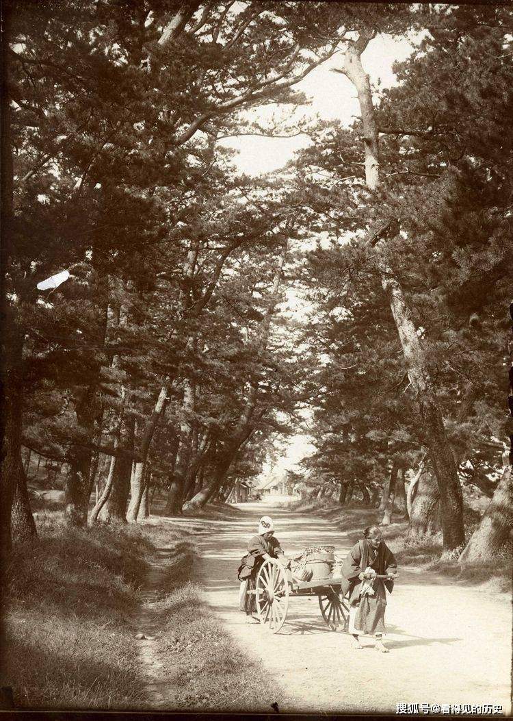 10. ในปี พ.ศ. 2450 ถนนหลังเสาโบราณของญี่ปุ่น สองข้างทางมีไม้ยืนต้นสูงตระหง่าน ตรงกลางมีป้าชาวญี่ปุ่นกำลังลากเกวียนเปล่า