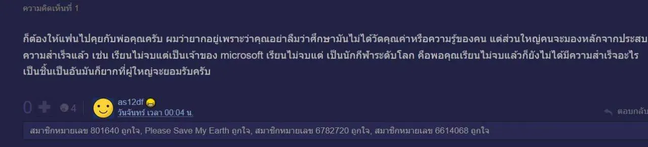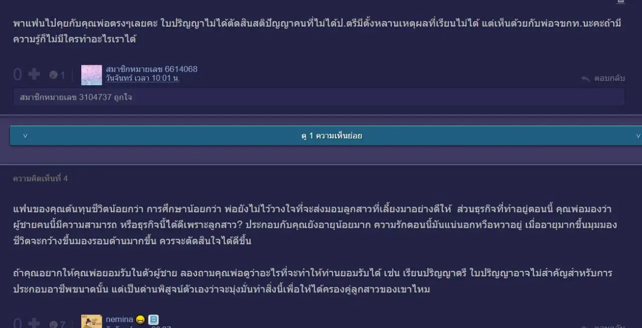 ซึ่งพ่อของเราไม่โอเคค่ะ ที่แฟนเราไม่เรียนต่อป.ตรี เพราะพ่อคิดว่าแฟนไม่ได้เรียน ไม่มีความรู้และอาจจะดูแลเราไม่ได้ในอนาคตค่ะ แต่เราคิดว่าการศึกษามันไม่ได้วัดคุณค่าหรือความรู้ของคนนะคะ เค้าอาจจะเจออะไรมาเยอะกว่าเรา มีความคิดที่ดีกว่าเราก็ได้ค่ะ