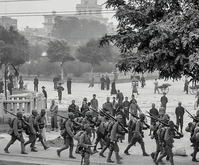 5. ทหารญี่ปุ่นที่หยิ่งทะนงกำลังเดินอยู่บนถนนในเมือง Peiping