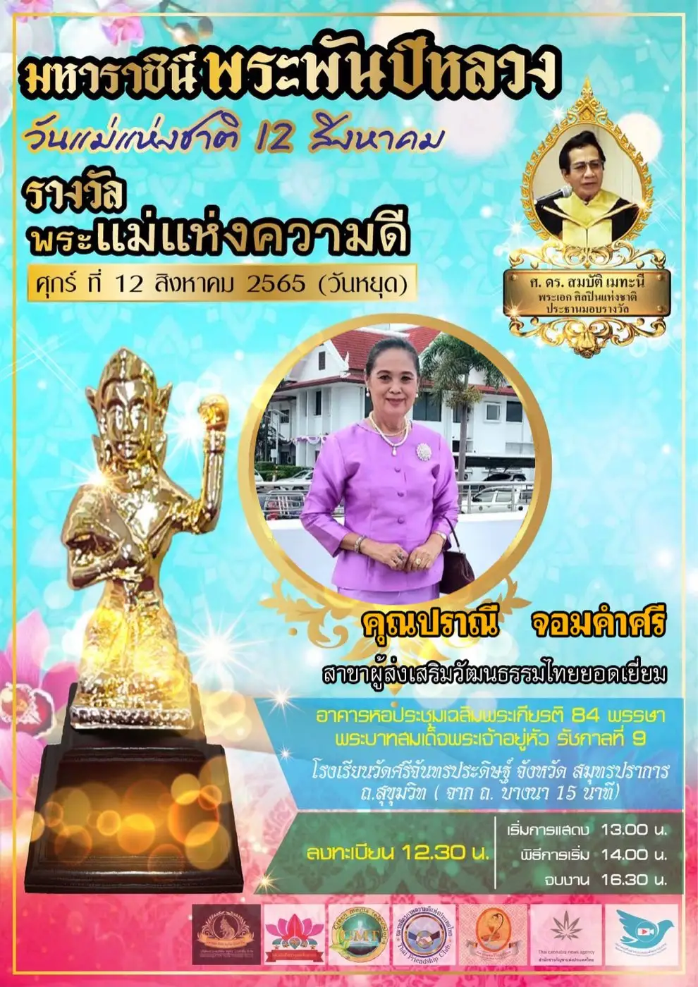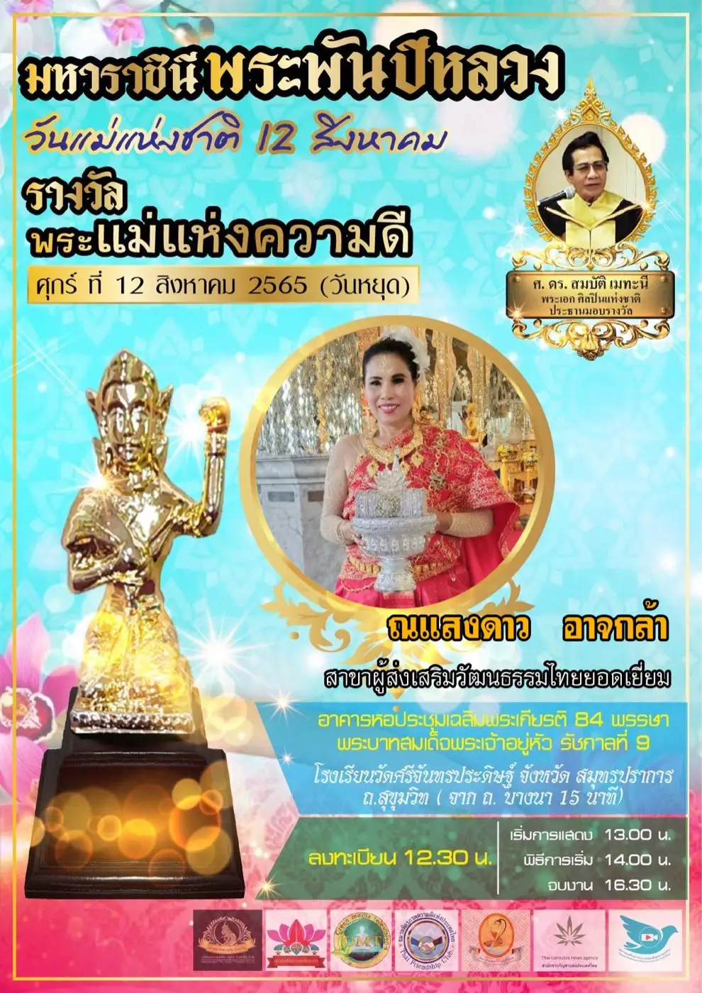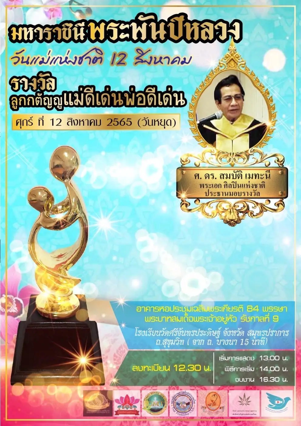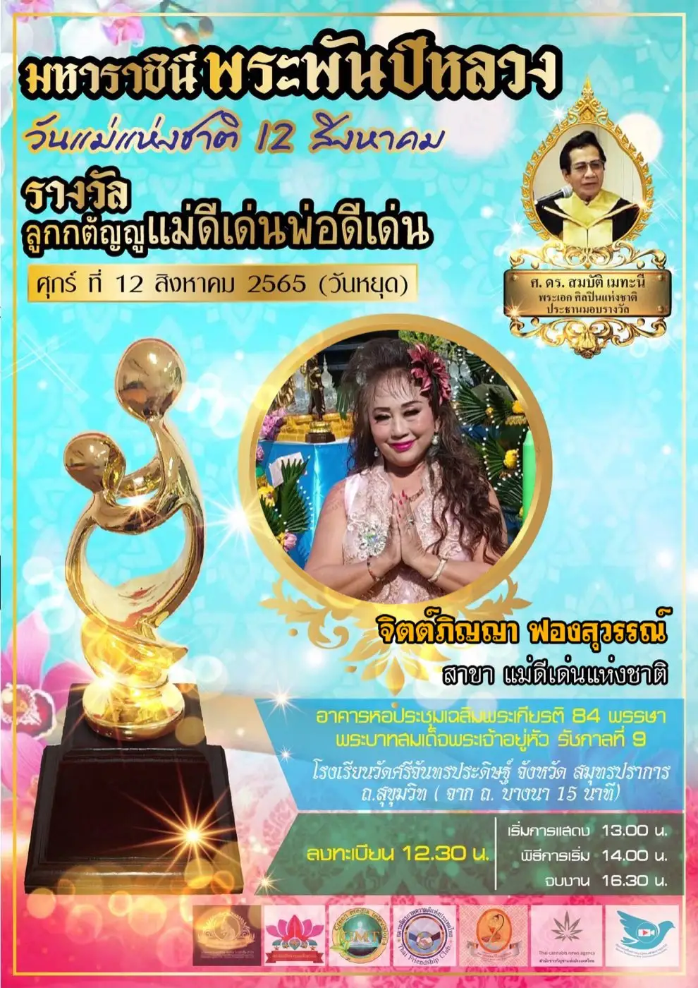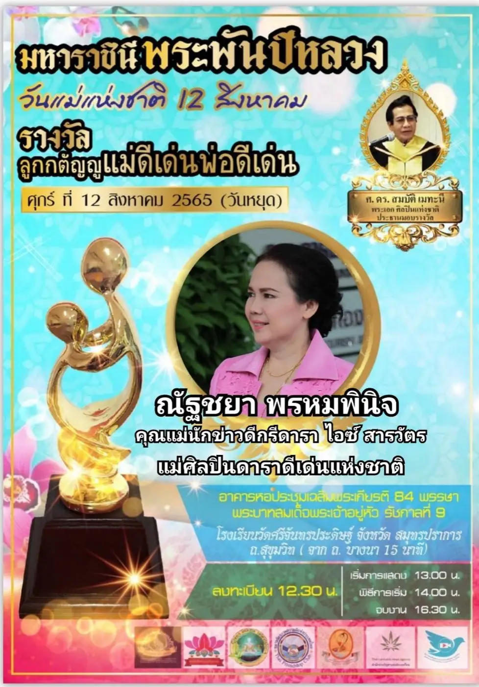 สภาศิลปินทำความดีเพื่อศาสนา ร่วมกับบริษัทมหามงคลฟิล์ม สตูดิโอ โปรดักชั่น ผู้จัดละครทางช่อง9MCOT HD จัดงานวันแม่แห่งชาติ12 สิงหามหาราชินีพระพันปีหลวง ณ หอประชุมเฉลิมพระเกียรติฯ วัดศรีจันทร์ประดิษฐ์ จ สมุทรปราการ ดร.ชลารักษ์ สายอุทัศน์ ผู้อำนวยการโรงเรียนมัธยมวัดศรีจันทร์ประดิษฐ์ ในพระบรมราชานุเคราะห์ สังกัดสำนักงานเขตพื้นที่การศึกษามัธยมศึกษาสมุทรปราการ โดยมีศาสตรจารย์ ดร.สมบัติ เมทะนี ประธานจัดงาน โดยมีดาราศิลปินนางงามนายแบบเซเลปพระสงฆ์😆CEO ทุกอาชีพ เข้ารับรางวัลศิลปินลูกกกตัญญู บุคคลดีเด่น ครูดีเด่น แม่แบบดีเด่น แม่ดีเด่นมากมายอาทิ