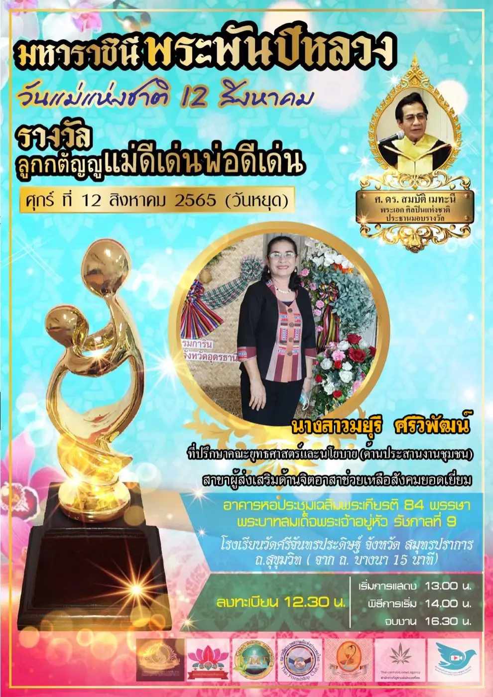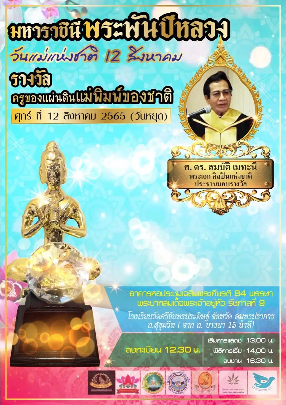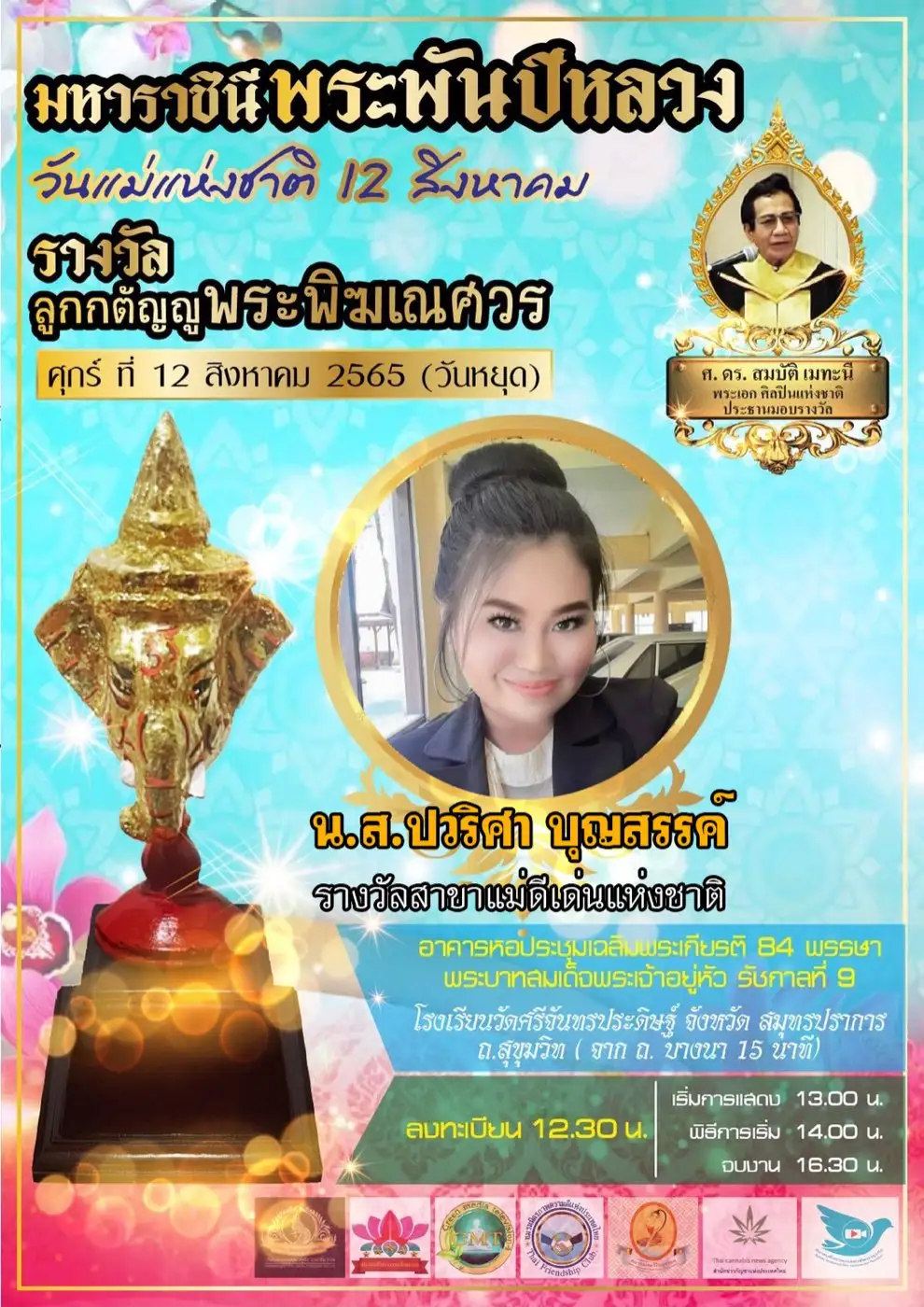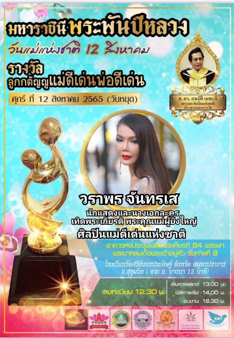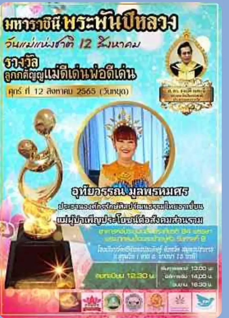 สภาศิลปินทำความดีเพื่อศาสนา ร่วมกับบริษัทมหามงคลฟิล์ม สตูดิโอ โปรดักชั่น ผู้จัดละครทางช่อง9MCOT HD จัดงานวันแม่แห่งชาติ12 สิงหามหาราชินีพระพันปีหลวง ณ หอประชุมเฉลิมพระเกียรติฯ วัดศรีจันทร์ประดิษฐ์ จ สมุทรปราการ ดร.ชลารักษ์ สายอุทัศน์ ผู้อำนวยการโรงเรียนมัธยมวัดศรีจันทร์ประดิษฐ์ ในพระบรมราชานุเคราะห์ สังกัดสำนักงานเขตพื้นที่การศึกษามัธยมศึกษาสมุทรปราการ โดยมีศาสตรจารย์ ดร.สมบัติ เมทะนี ประธานจัดงาน โดยมีดาราศิลปินนางงามนายแบบเซเลปพระสงฆ์😆CEO ทุกอาชีพ เข้ารับรางวัลศิลปินลูกกกตัญญู บุคคลดีเด่น ครูดีเด่น แม่แบบดีเด่น แม่ดีเด่นมากมายอาทิ