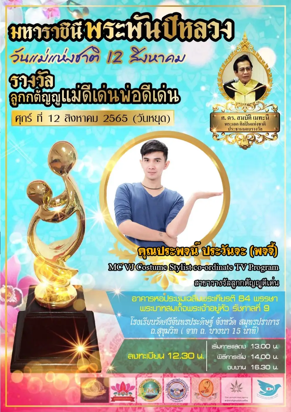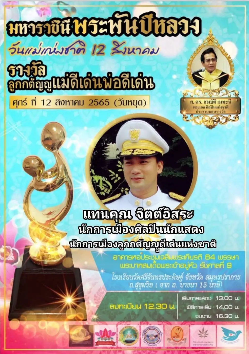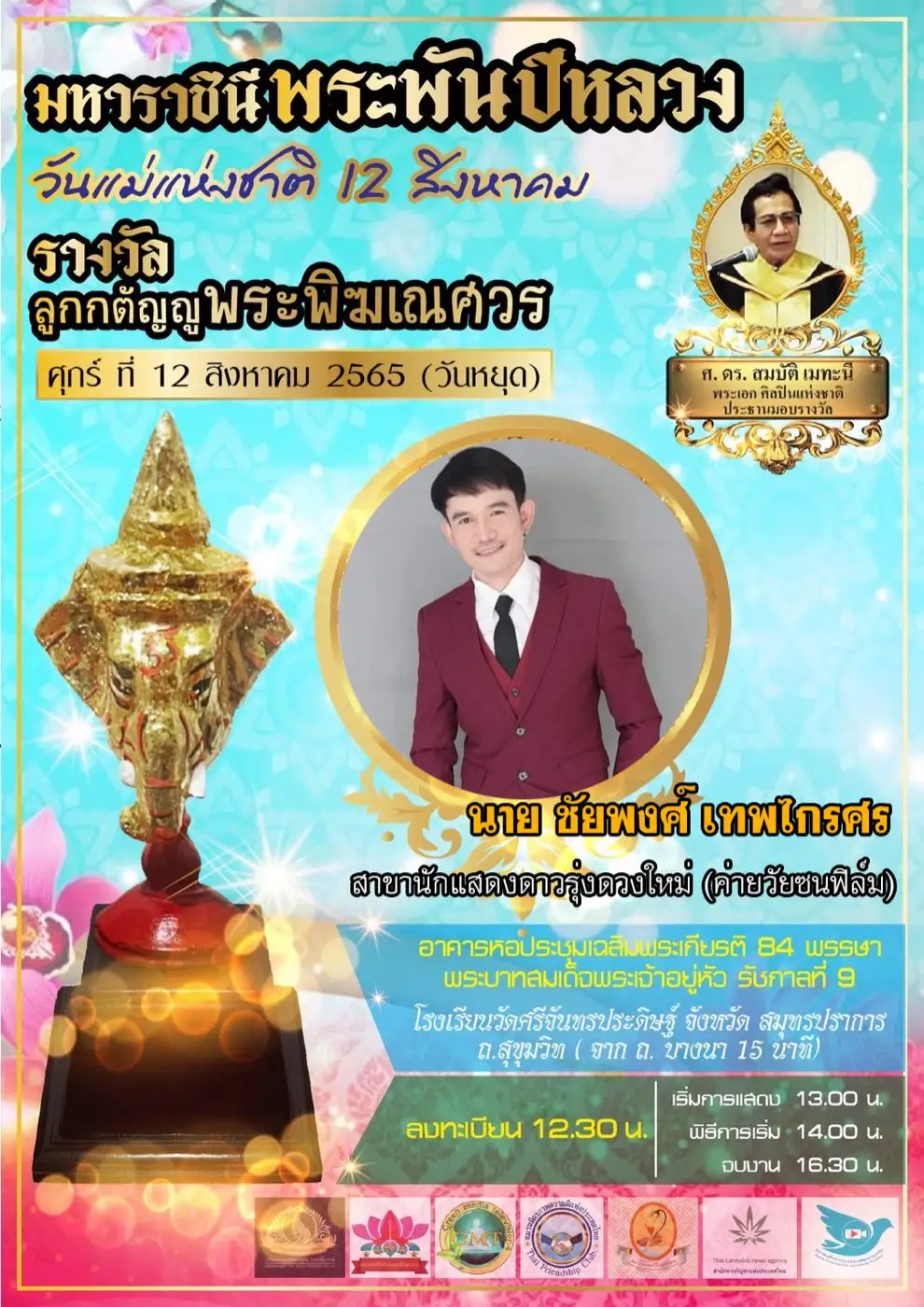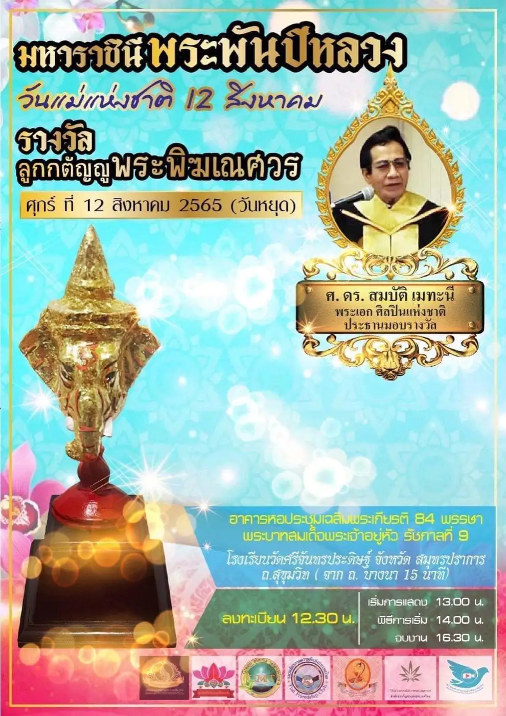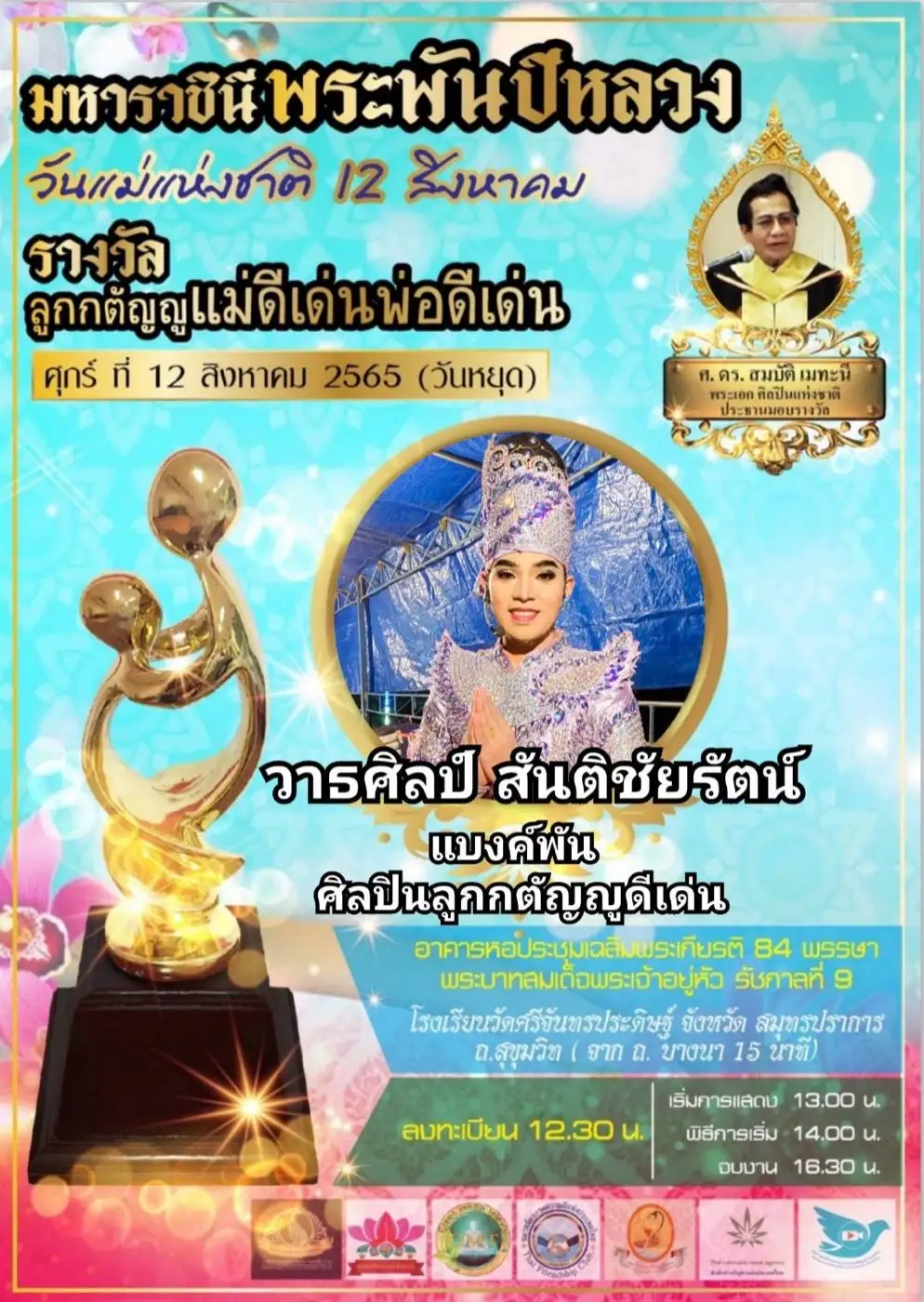 สภาศิลปินทำความดีเพื่อศาสนา ร่วมกับบริษัทมหามงคลฟิล์ม สตูดิโอ โปรดักชั่น ผู้จัดละครทางช่อง9MCOT HD จัดงานวันแม่แห่งชาติ12 สิงหามหาราชินีพระพันปีหลวง ณ หอประชุมเฉลิมพระเกียรติฯ วัดศรีจันทร์ประดิษฐ์ จ สมุทรปราการ ดร.ชลารักษ์ สายอุทัศน์ ผู้อำนวยการโรงเรียนมัธยมวัดศรีจันทร์ประดิษฐ์ ในพระบรมราชานุเคราะห์ สังกัดสำนักงานเขตพื้นที่การศึกษามัธยมศึกษาสมุทรปราการ โดยมีศาสตรจารย์ ดร.สมบัติ เมทะนี ประธานจัดงาน โดยมีดาราศิลปินนางงามนายแบบเซเลปพระสงฆ์😆CEO ทุกอาชีพ เข้ารับรางวัลศิลปินลูกกกตัญญู บุคคลดีเด่น ครูดีเด่น แม่แบบดีเด่น แม่ดีเด่นมากมายอาทิ