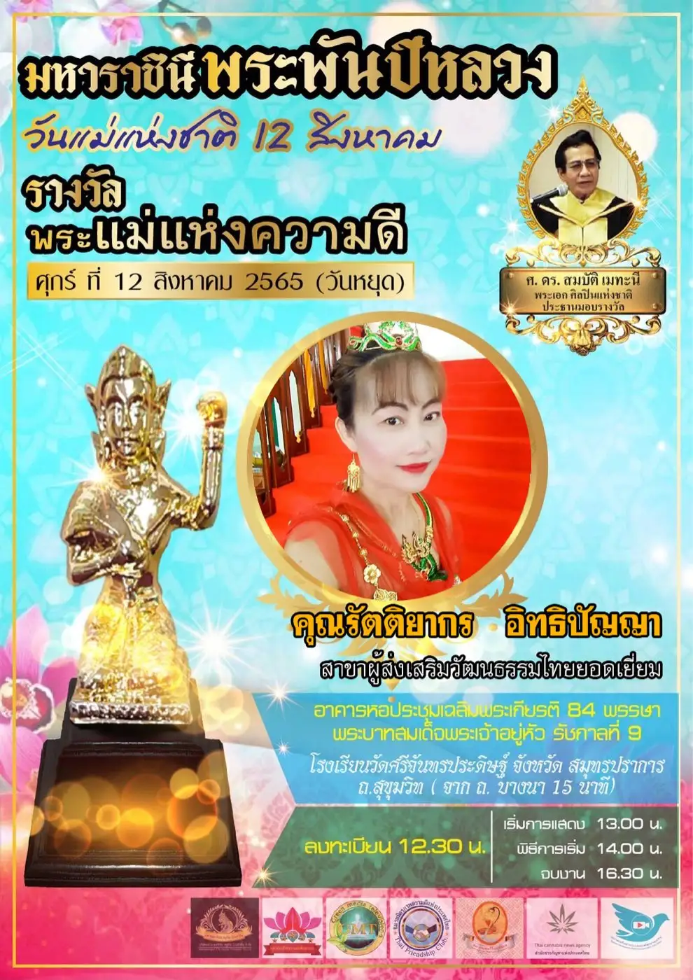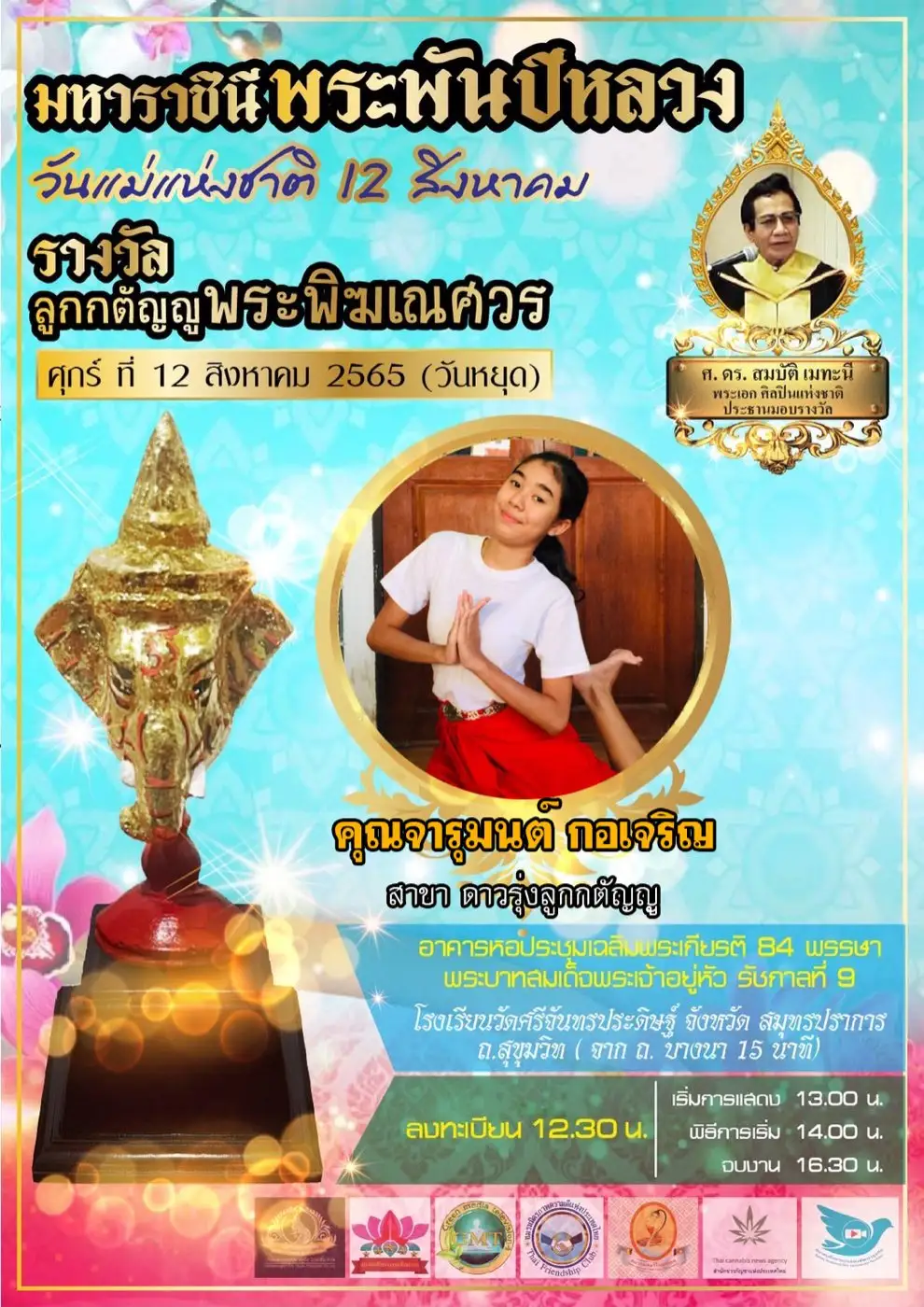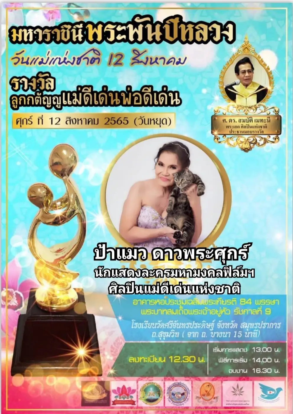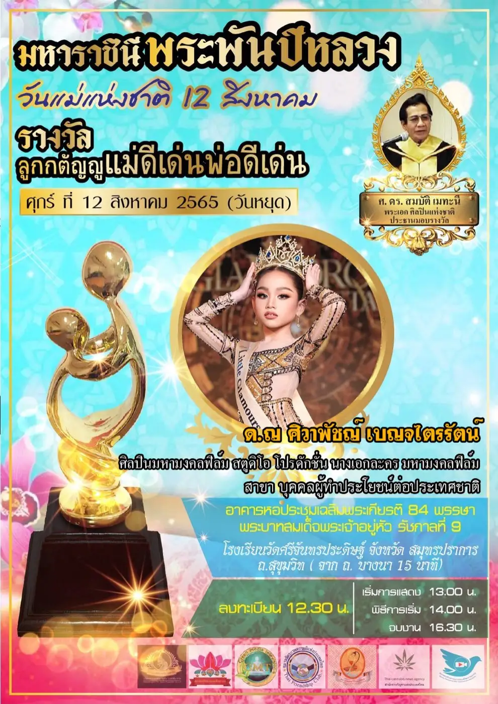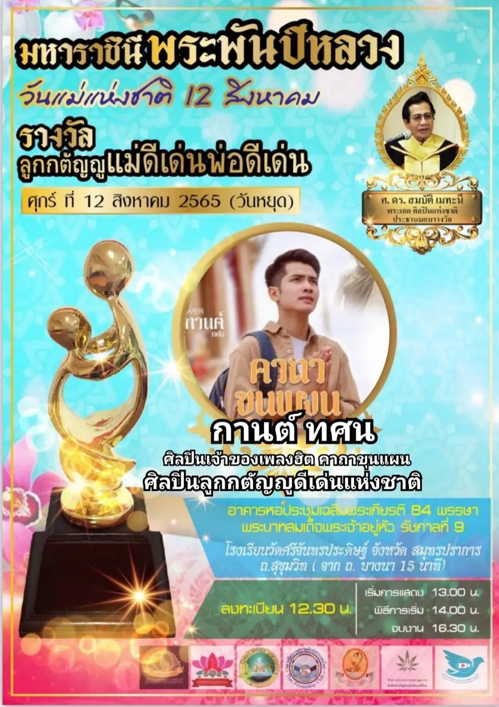 สภาศิลปินทำความดีเพื่อศาสนา ร่วมกับบริษัทมหามงคลฟิล์ม สตูดิโอ โปรดักชั่น ผู้จัดละครทางช่อง9MCOT HD จัดงานวันแม่แห่งชาติ12 สิงหามหาราชินีพระพันปีหลวง ณ หอประชุมเฉลิมพระเกียรติฯ วัดศรีจันทร์ประดิษฐ์ จ สมุทรปราการ ดร.ชลารักษ์ สายอุทัศน์ ผู้อำนวยการโรงเรียนมัธยมวัดศรีจันทร์ประดิษฐ์ ในพระบรมราชานุเคราะห์ สังกัดสำนักงานเขตพื้นที่การศึกษามัธยมศึกษาสมุทรปราการ โดยมีศาสตรจารย์ ดร.สมบัติ เมทะนี ประธานจัดงาน โดยมีดาราศิลปินนางงามนายแบบเซเลปพระสงฆ์😆CEO ทุกอาชีพ เข้ารับรางวัลศิลปินลูกกกตัญญู บุคคลดีเด่น ครูดีเด่น แม่แบบดีเด่น แม่ดีเด่นมากมายอาทิ