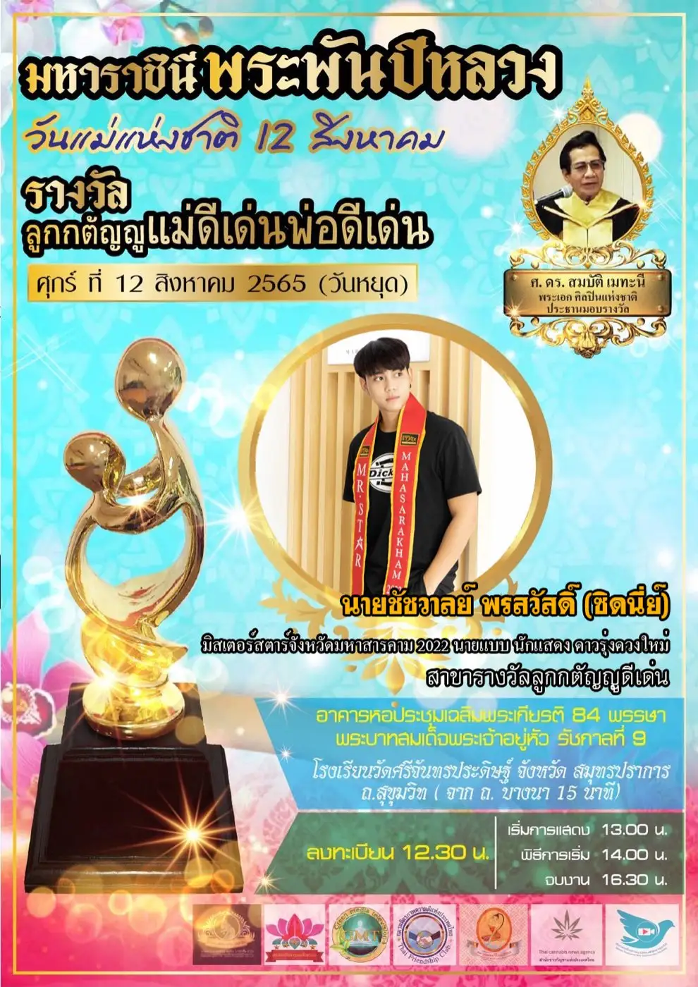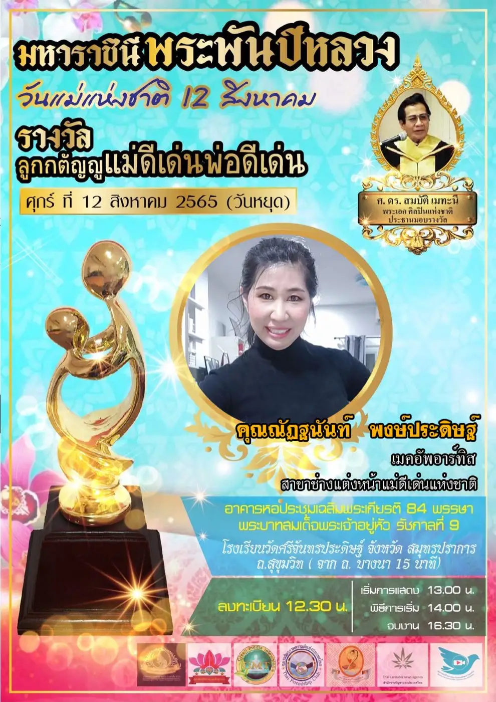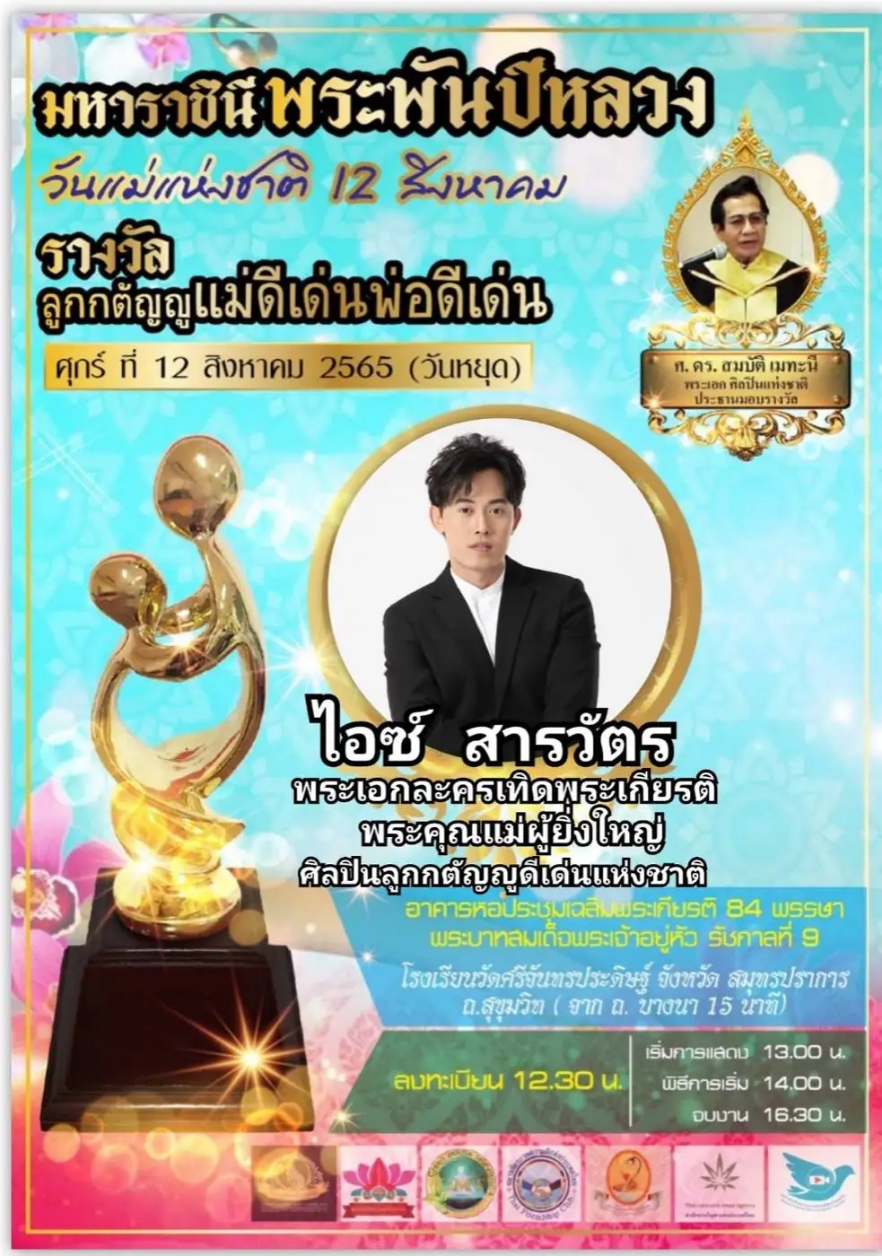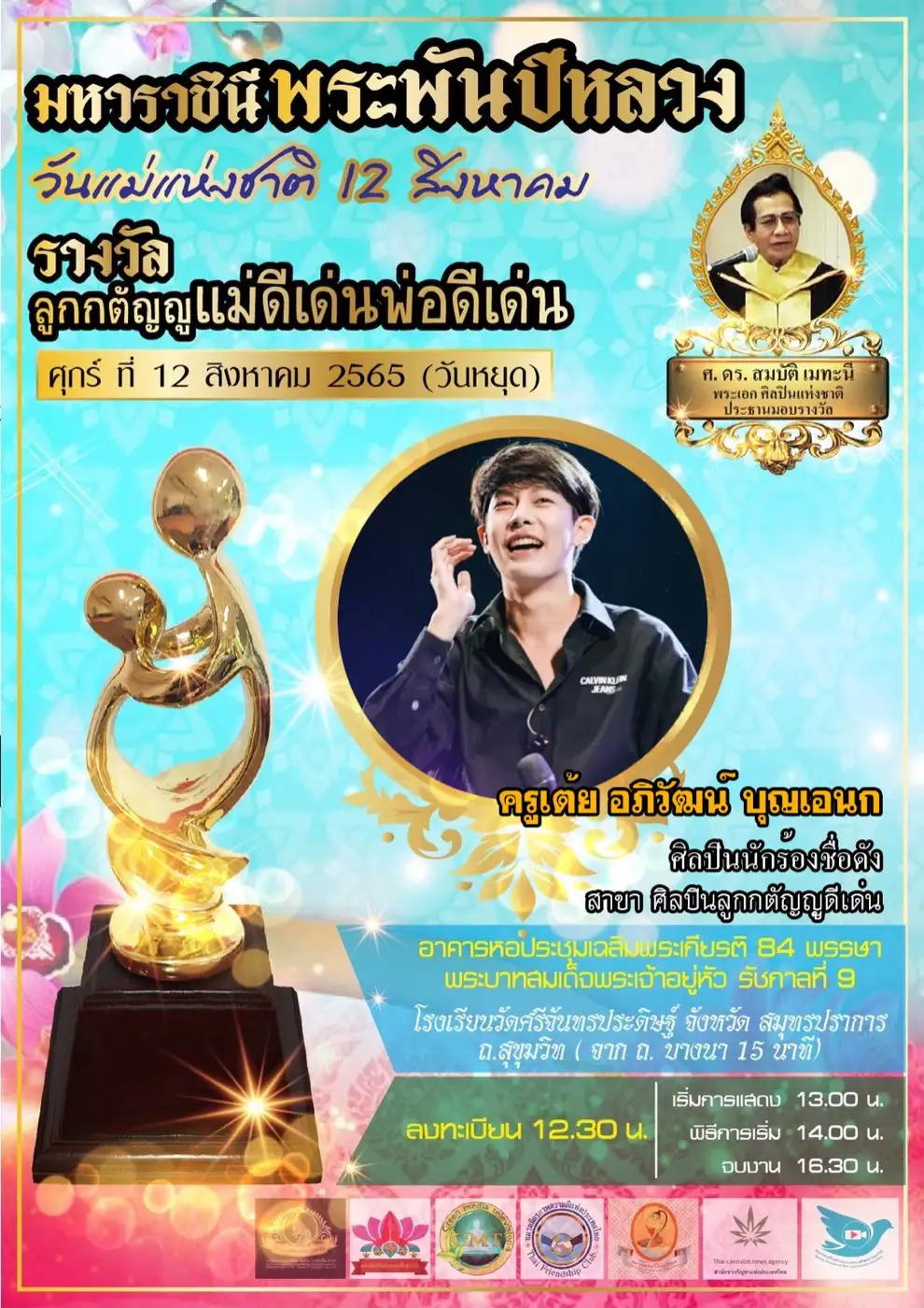 สภาศิลปินทำความดีเพื่อศาสนา ร่วมกับบริษัทมหามงคลฟิล์ม สตูดิโอ โปรดักชั่น ผู้จัดละครทางช่อง9MCOT HD จัดงานวันแม่แห่งชาติ12 สิงหามหาราชินีพระพันปีหลวง ณ หอประชุมเฉลิมพระเกียรติฯ วัดศรีจันทร์ประดิษฐ์ จ สมุทรปราการ ดร.ชลารักษ์ สายอุทัศน์ ผู้อำนวยการโรงเรียนมัธยมวัดศรีจันทร์ประดิษฐ์ ในพระบรมราชานุเคราะห์ สังกัดสำนักงานเขตพื้นที่การศึกษามัธยมศึกษาสมุทรปราการ โดยมีศาสตรจารย์ ดร.สมบัติ เมทะนี ประธานจัดงาน โดยมีดาราศิลปินนางงามนายแบบเซเลปพระสงฆ์😆CEO ทุกอาชีพ เข้ารับรางวัลศิลปินลูกกกตัญญู บุคคลดีเด่น ครูดีเด่น แม่แบบดีเด่น แม่ดีเด่นมากมายอาทิ
