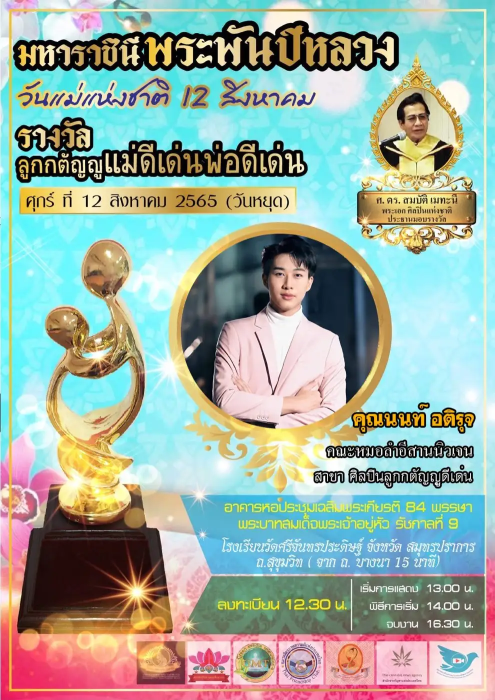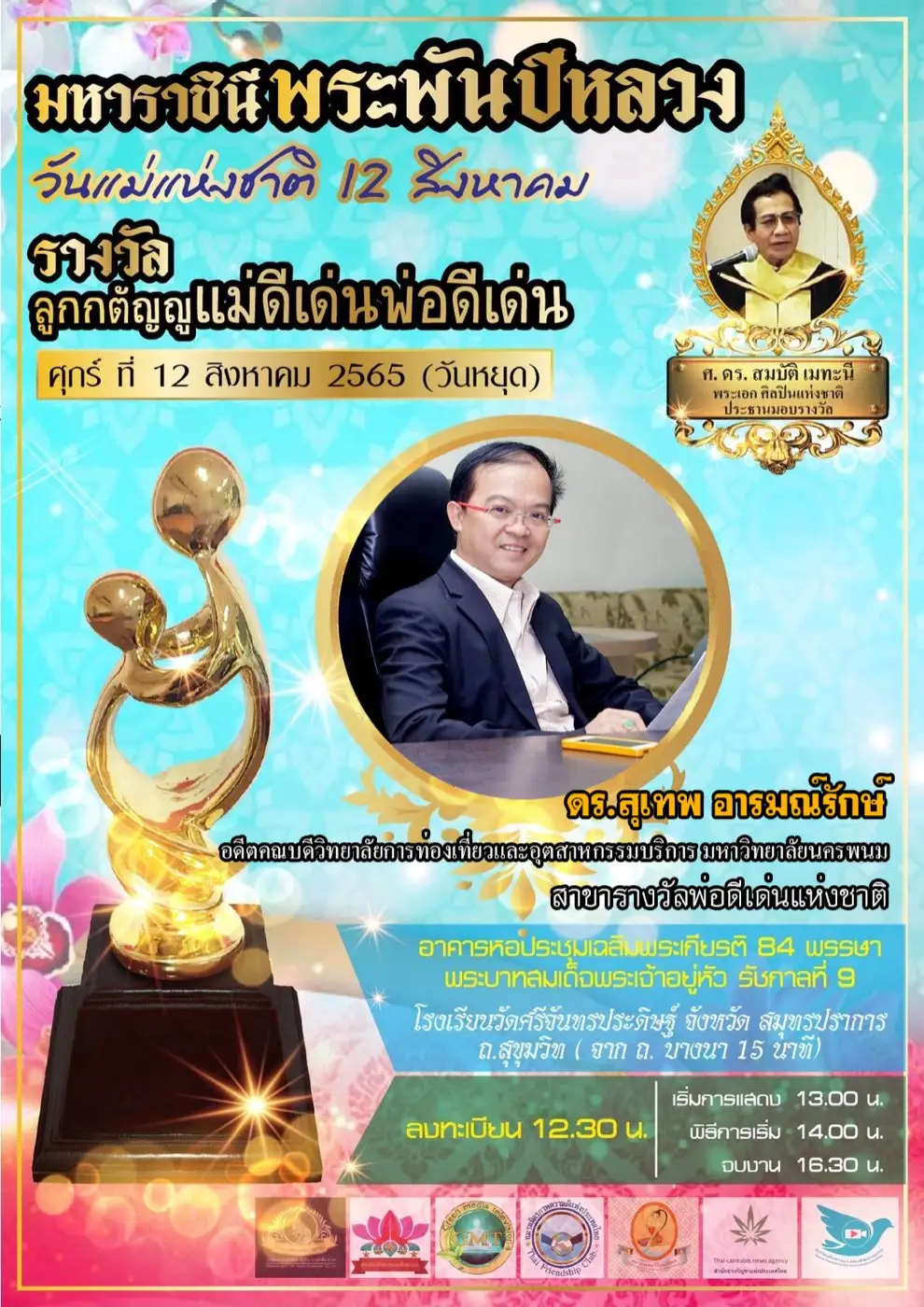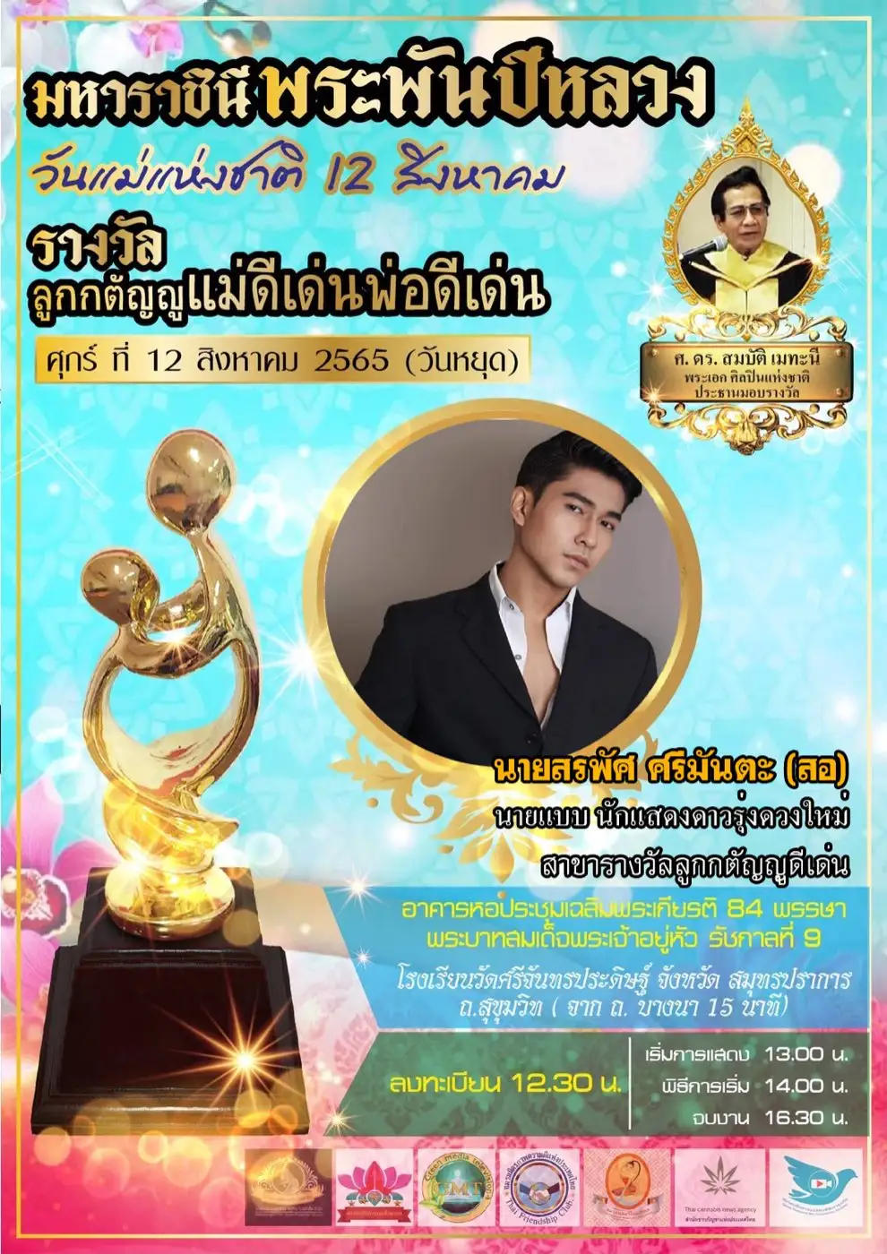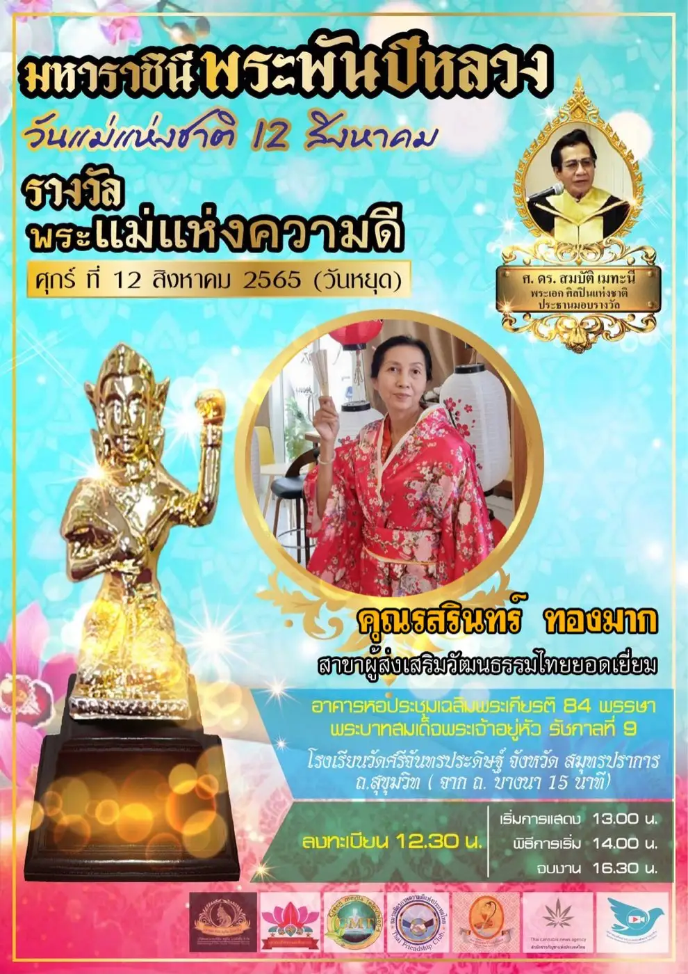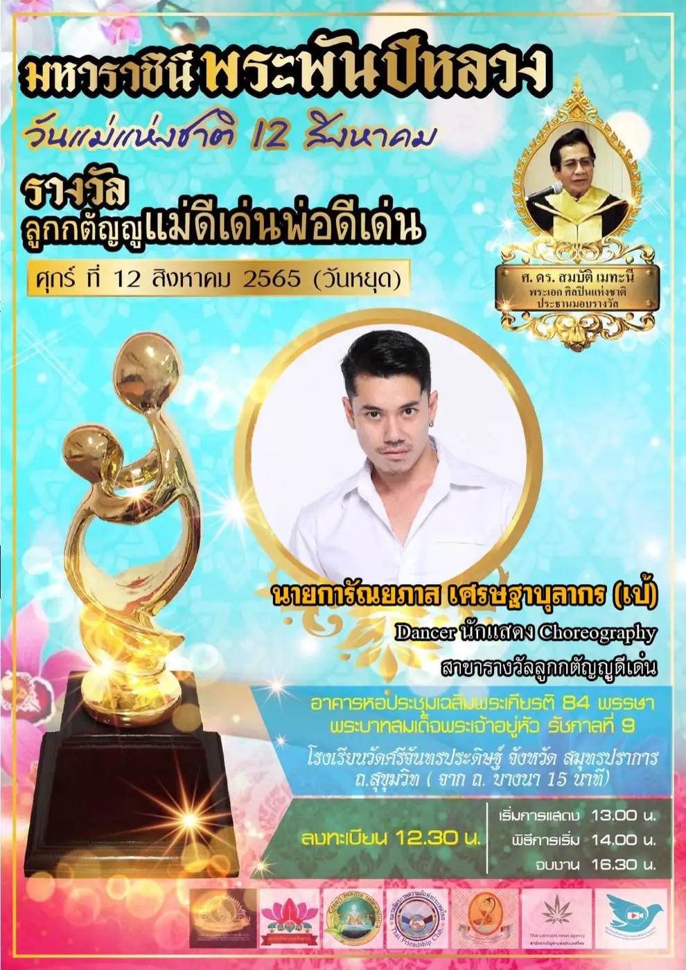 สภาศิลปินทำความดีเพื่อศาสนา ร่วมกับบริษัทมหามงคลฟิล์ม สตูดิโอ โปรดักชั่น ผู้จัดละครทางช่อง9MCOT HD จัดงานวันแม่แห่งชาติ12 สิงหามหาราชินีพระพันปีหลวง ณ หอประชุมเฉลิมพระเกียรติฯ วัดศรีจันทร์ประดิษฐ์ จ สมุทรปราการ ดร.ชลารักษ์ สายอุทัศน์ ผู้อำนวยการโรงเรียนมัธยมวัดศรีจันทร์ประดิษฐ์ ในพระบรมราชานุเคราะห์ สังกัดสำนักงานเขตพื้นที่การศึกษามัธยมศึกษาสมุทรปราการ โดยมีศาสตรจารย์ ดร.สมบัติ เมทะนี ประธานจัดงาน โดยมีดาราศิลปินนางงามนายแบบเซเลปพระสงฆ์😆CEO ทุกอาชีพ เข้ารับรางวัลศิลปินลูกกกตัญญู บุคคลดีเด่น ครูดีเด่น แม่แบบดีเด่น แม่ดีเด่นมากมายอาทิ