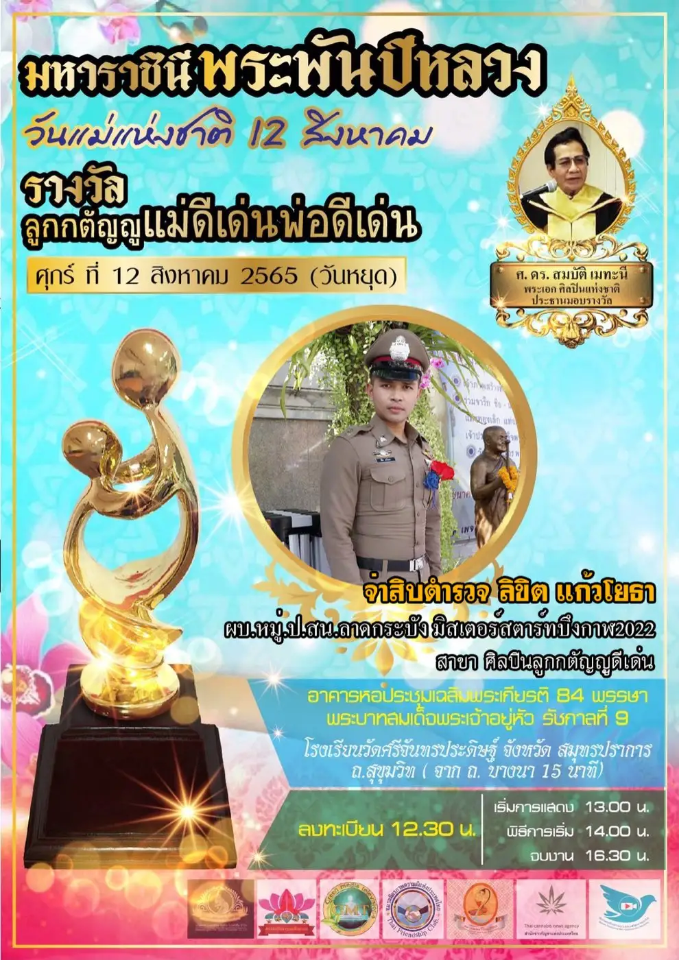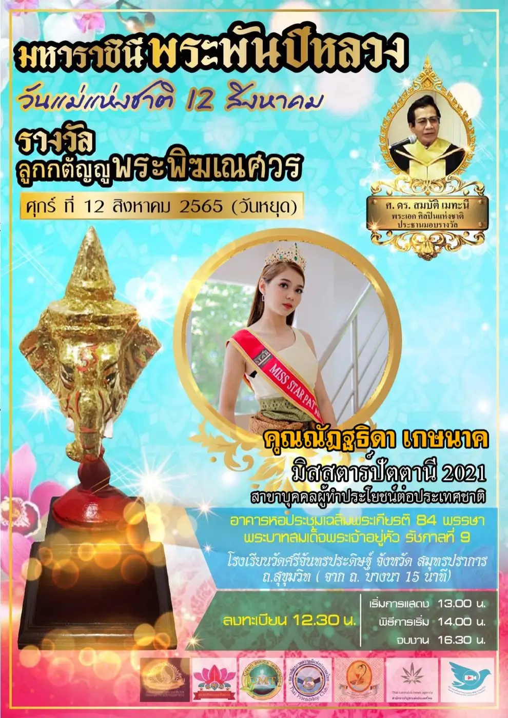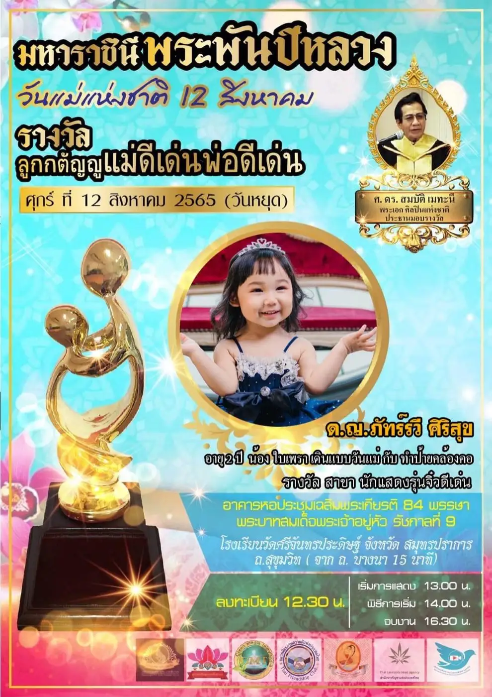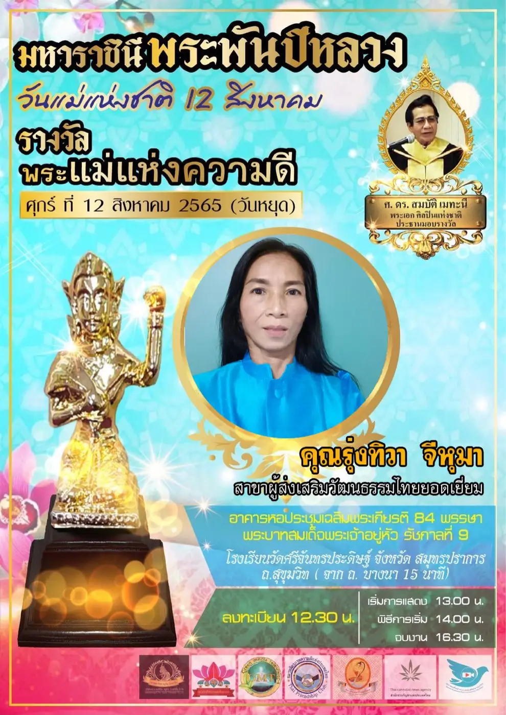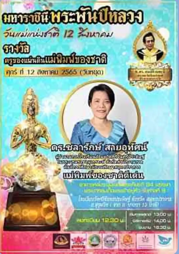 สภาศิลปินทำความดีเพื่อศาสนา ร่วมกับบริษัทมหามงคลฟิล์ม สตูดิโอ โปรดักชั่น ผู้จัดละครทางช่อง9MCOT HD จัดงานวันแม่แห่งชาติ12 สิงหามหาราชินีพระพันปีหลวง ณ หอประชุมเฉลิมพระเกียรติฯ วัดศรีจันทร์ประดิษฐ์ จ สมุทรปราการ ดร.ชลารักษ์ สายอุทัศน์ ผู้อำนวยการโรงเรียนมัธยมวัดศรีจันทร์ประดิษฐ์ ในพระบรมราชานุเคราะห์ สังกัดสำนักงานเขตพื้นที่การศึกษามัธยมศึกษาสมุทรปราการ โดยมีศาสตรจารย์ ดร.สมบัติ เมทะนี ประธานจัดงาน โดยมีดาราศิลปินนางงามนายแบบเซเลปพระสงฆ์😆CEO ทุกอาชีพ เข้ารับรางวัลศิลปินลูกกกตัญญู บุคคลดีเด่น ครูดีเด่น แม่แบบดีเด่น แม่ดีเด่นมากมายอาทิ