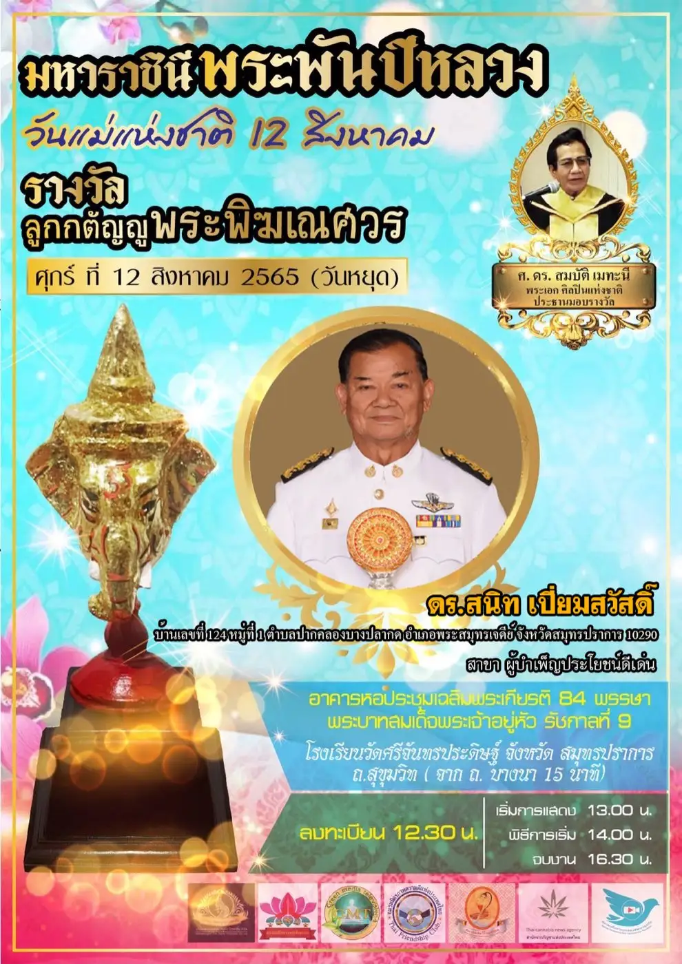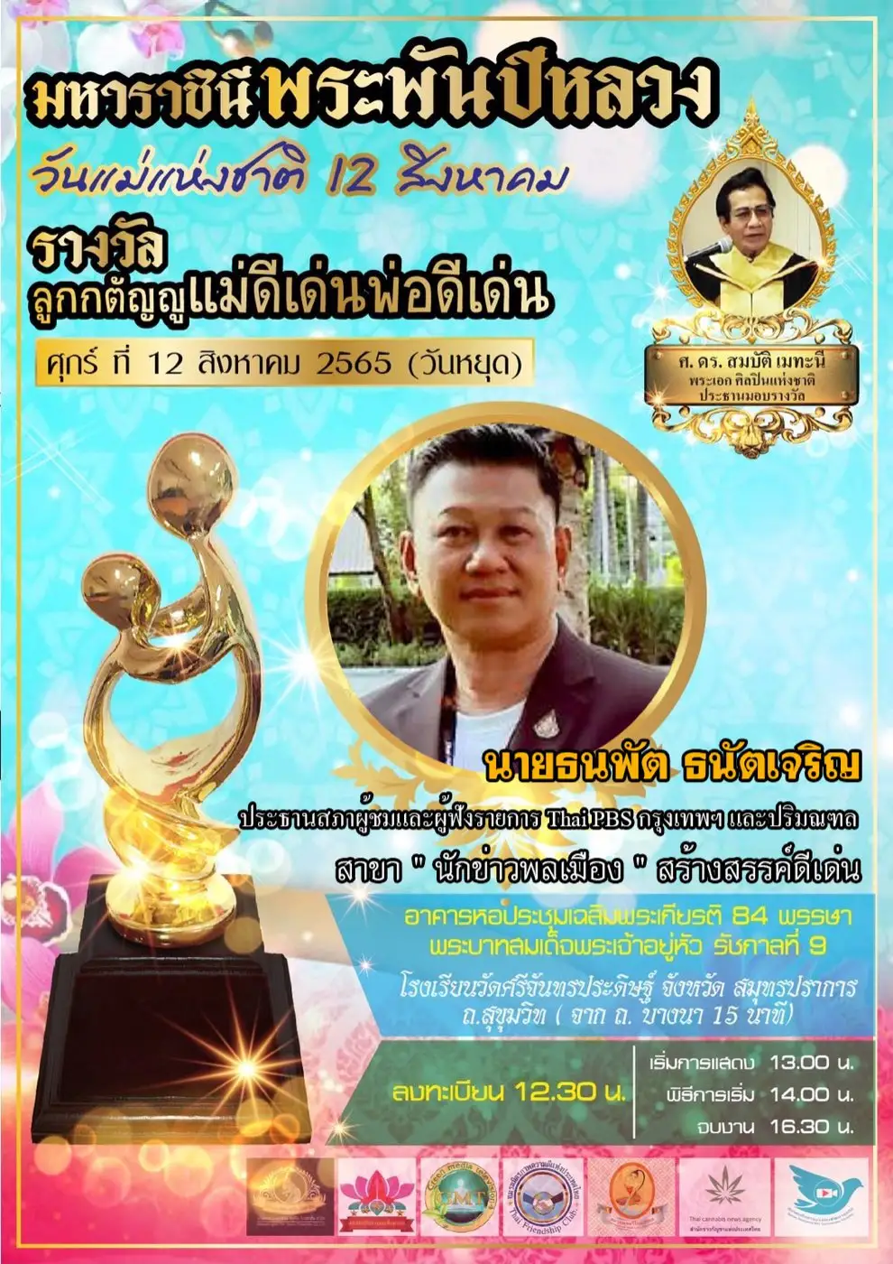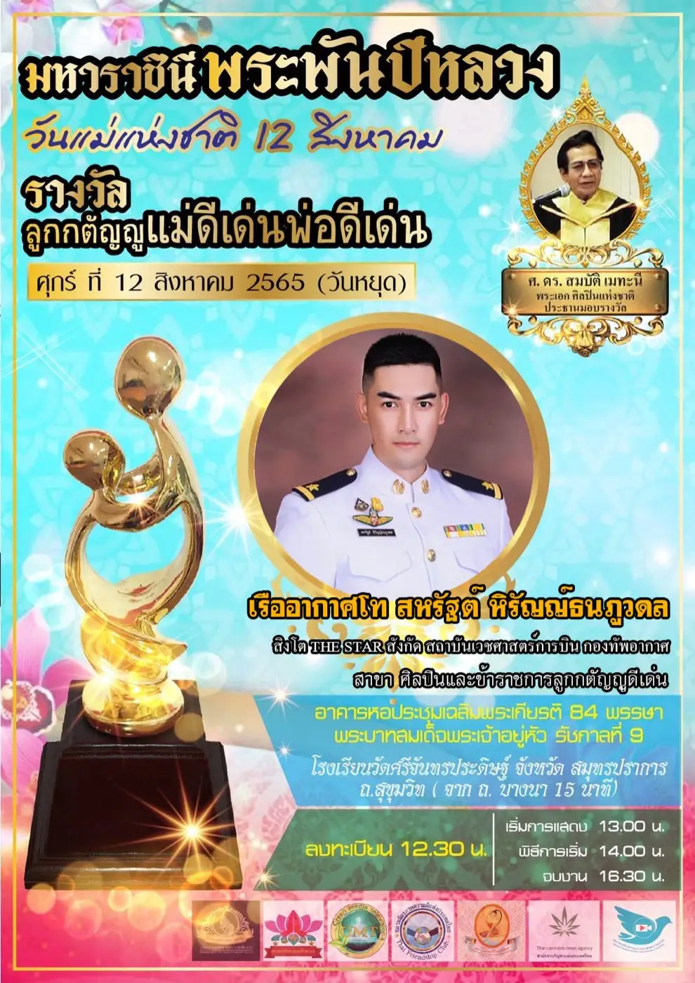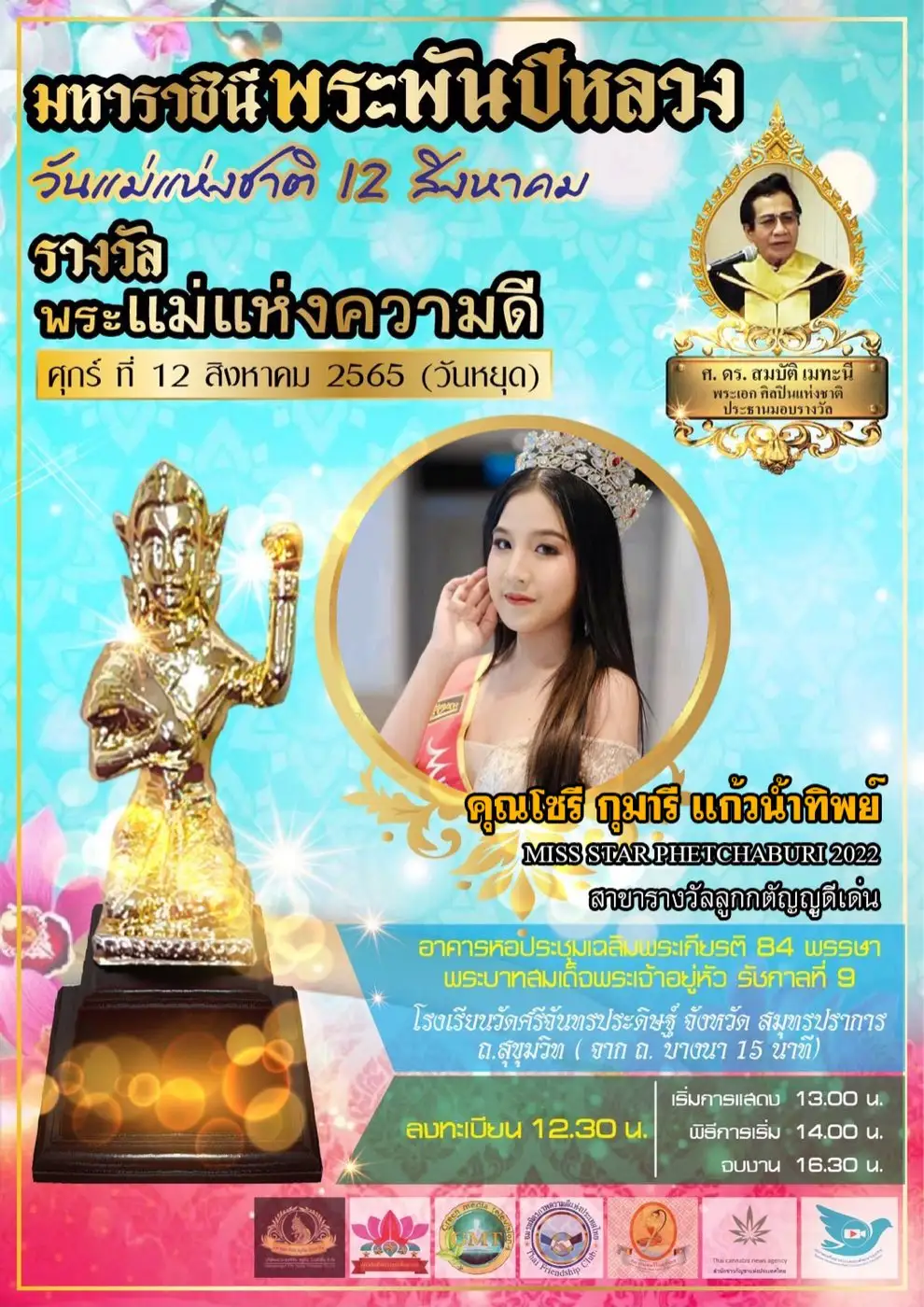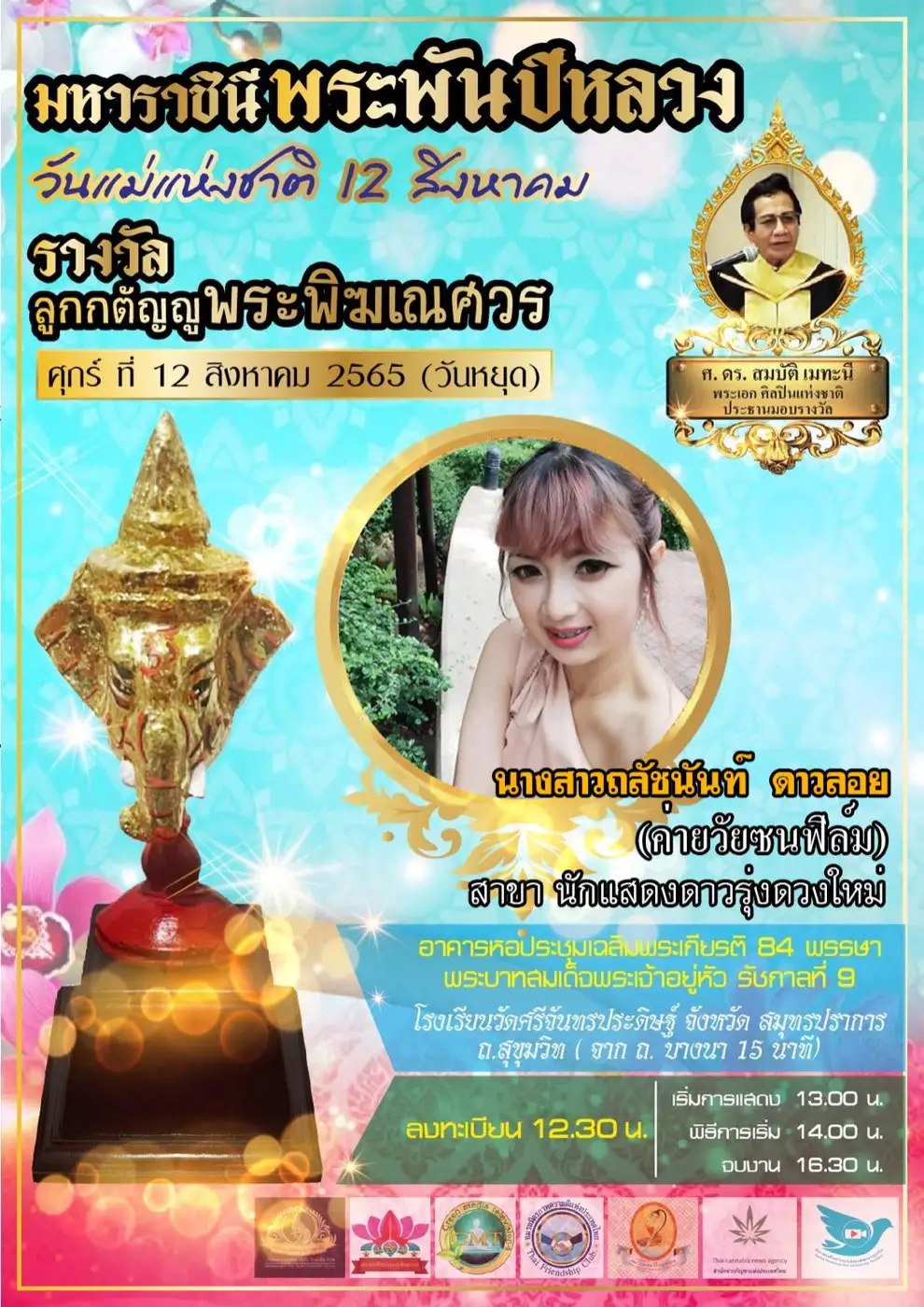 สภาศิลปินทำความดีเพื่อศาสนา ร่วมกับบริษัทมหามงคลฟิล์ม สตูดิโอ โปรดักชั่น ผู้จัดละครทางช่อง9MCOT HD จัดงานวันแม่แห่งชาติ12 สิงหามหาราชินีพระพันปีหลวง ณ หอประชุมเฉลิมพระเกียรติฯ วัดศรีจันทร์ประดิษฐ์ จ สมุทรปราการ ดร.ชลารักษ์ สายอุทัศน์ ผู้อำนวยการโรงเรียนมัธยมวัดศรีจันทร์ประดิษฐ์ ในพระบรมราชานุเคราะห์ สังกัดสำนักงานเขตพื้นที่การศึกษามัธยมศึกษาสมุทรปราการ โดยมีศาสตรจารย์ ดร.สมบัติ เมทะนี ประธานจัดงาน โดยมีดาราศิลปินนางงามนายแบบเซเลปพระสงฆ์😆CEO ทุกอาชีพ เข้ารับรางวัลศิลปินลูกกกตัญญู บุคคลดีเด่น ครูดีเด่น แม่แบบดีเด่น แม่ดีเด่นมากมายอาทิ