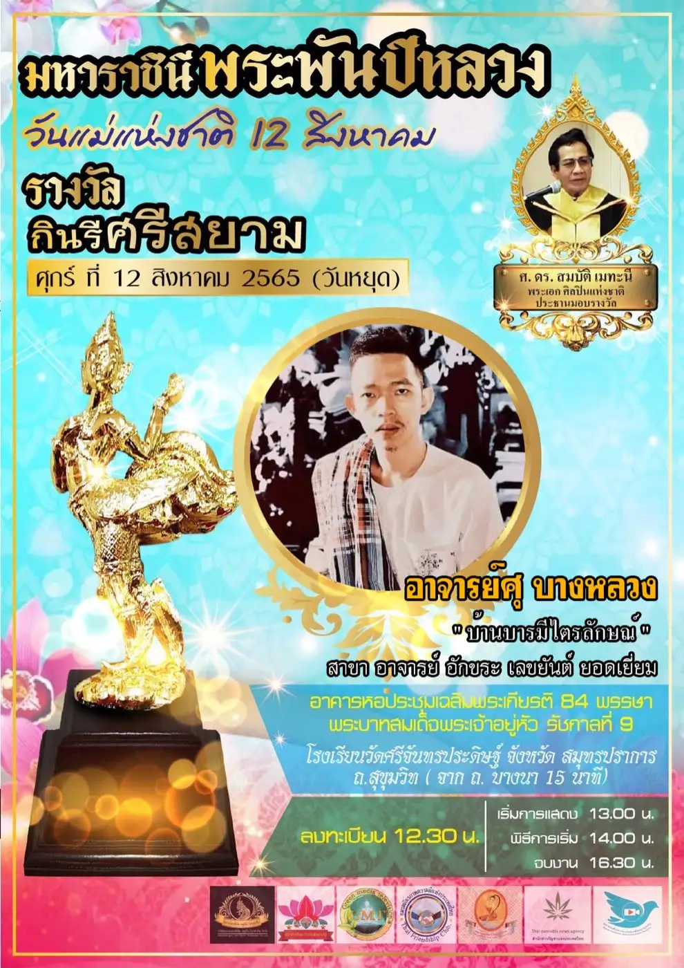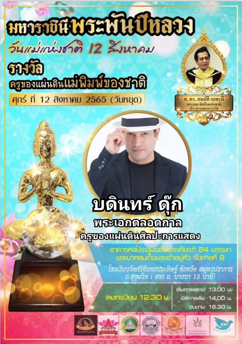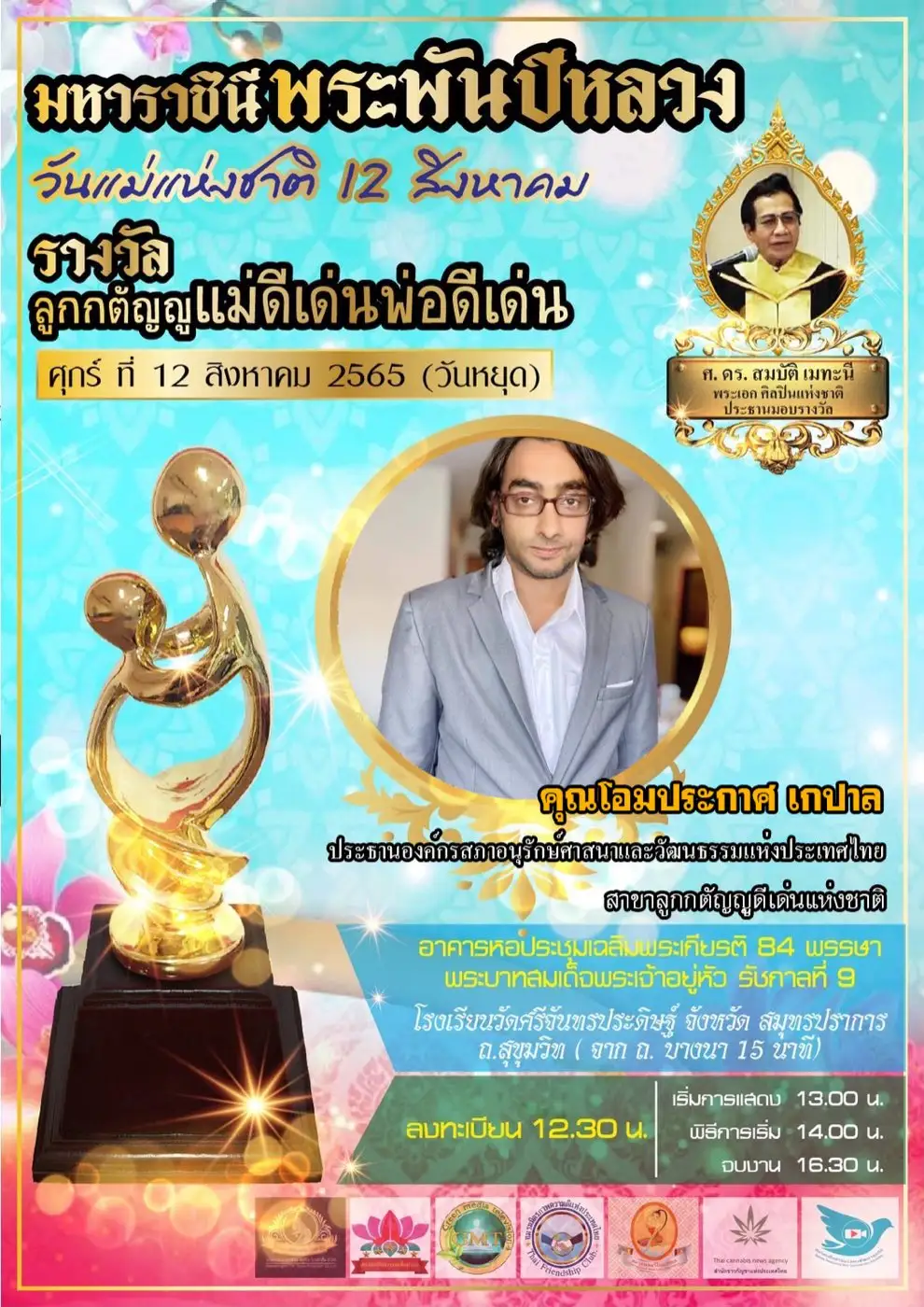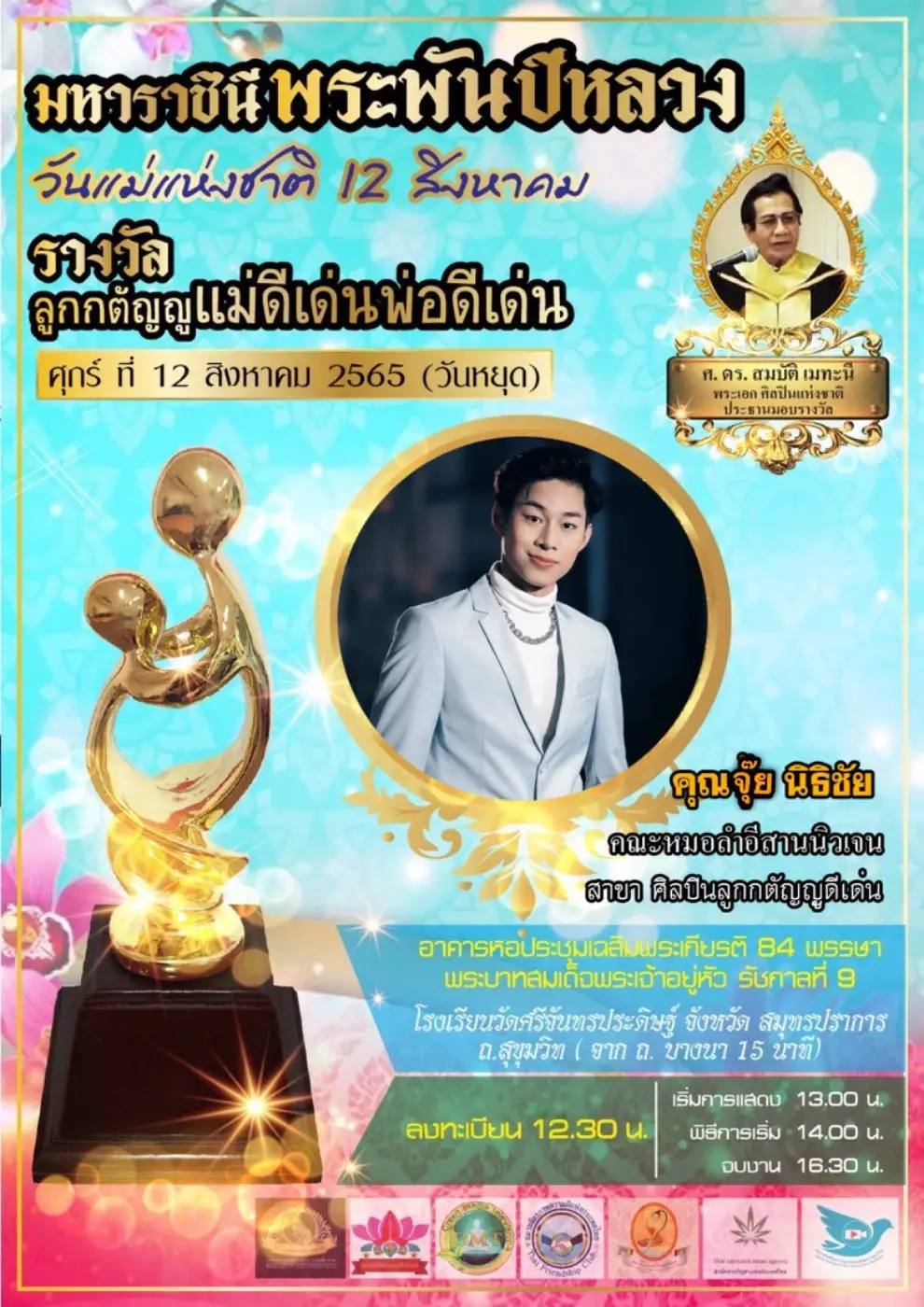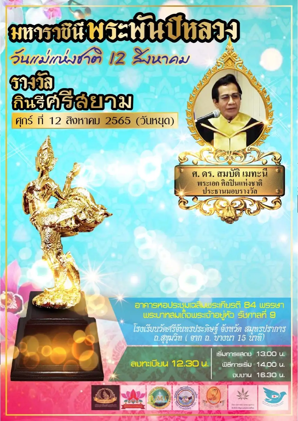 สภาศิลปินทำความดีเพื่อศาสนา ร่วมกับบริษัทมหามงคลฟิล์ม สตูดิโอ โปรดักชั่น ผู้จัดละครทางช่อง9MCOT HD จัดงานวันแม่แห่งชาติ12 สิงหามหาราชินีพระพันปีหลวง ณ หอประชุมเฉลิมพระเกียรติฯ วัดศรีจันทร์ประดิษฐ์ จ สมุทรปราการ ดร.ชลารักษ์ สายอุทัศน์ ผู้อำนวยการโรงเรียนมัธยมวัดศรีจันทร์ประดิษฐ์ ในพระบรมราชานุเคราะห์ สังกัดสำนักงานเขตพื้นที่การศึกษามัธยมศึกษาสมุทรปราการ โดยมีศาสตรจารย์ ดร.สมบัติ เมทะนี ประธานจัดงาน โดยมีดาราศิลปินนางงามนายแบบเซเลปพระสงฆ์😆CEO ทุกอาชีพ เข้ารับรางวัลศิลปินลูกกกตัญญู บุคคลดีเด่น ครูดีเด่น แม่แบบดีเด่น แม่ดีเด่นมากมายอาทิ