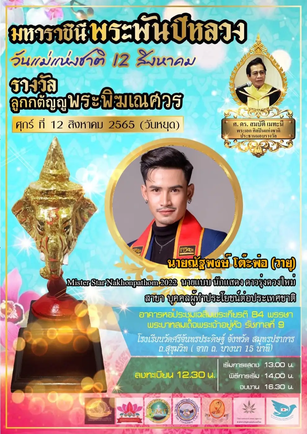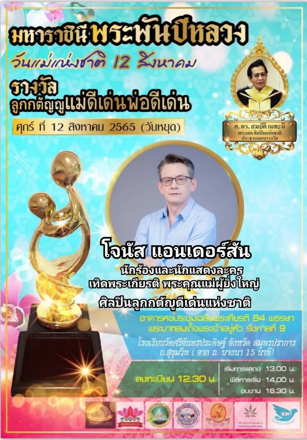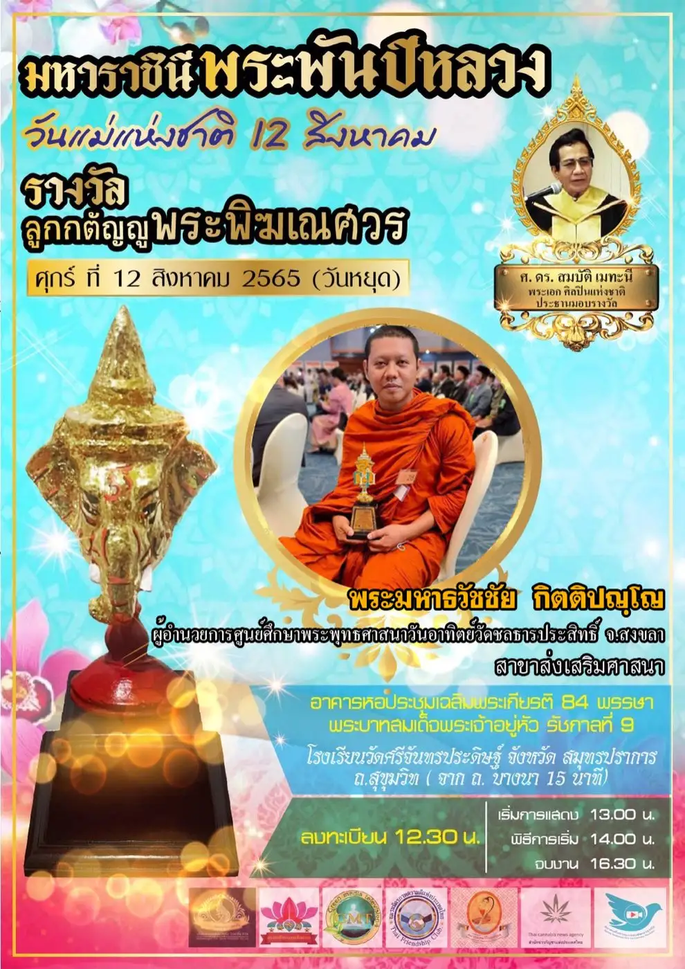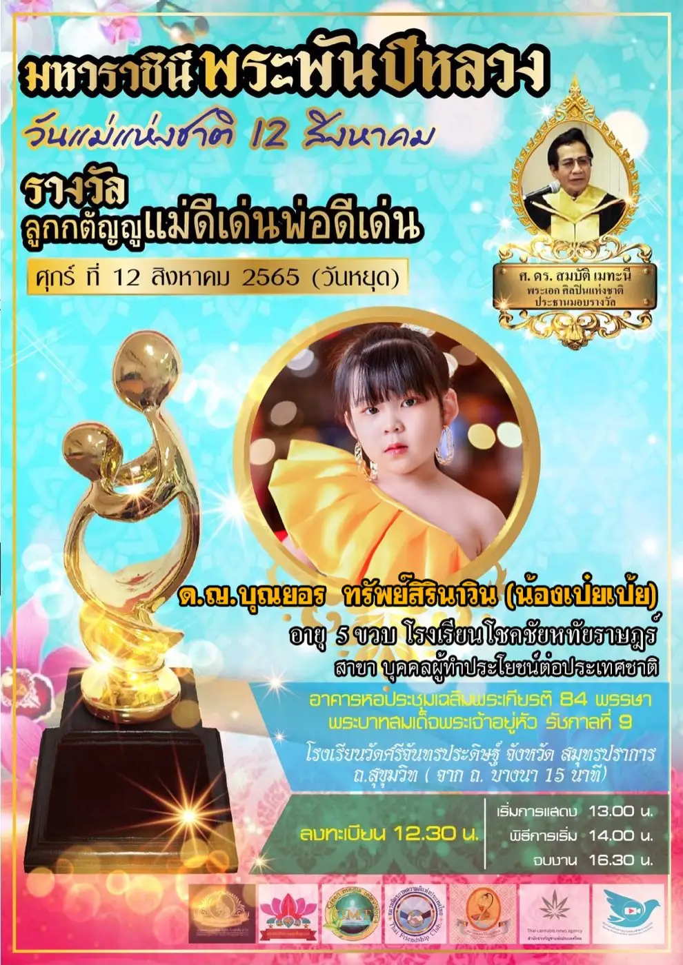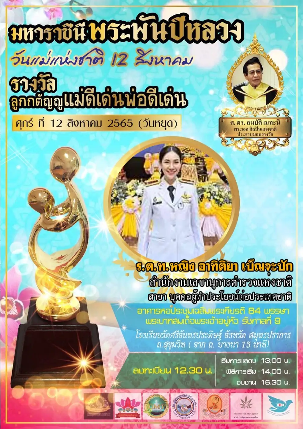 สภาศิลปินทำความดีเพื่อศาสนา ร่วมกับบริษัทมหามงคลฟิล์ม สตูดิโอ โปรดักชั่น ผู้จัดละครทางช่อง9MCOT HD จัดงานวันแม่แห่งชาติ12 สิงหามหาราชินีพระพันปีหลวง ณ หอประชุมเฉลิมพระเกียรติฯ วัดศรีจันทร์ประดิษฐ์ จ สมุทรปราการ ดร.ชลารักษ์ สายอุทัศน์ ผู้อำนวยการโรงเรียนมัธยมวัดศรีจันทร์ประดิษฐ์ ในพระบรมราชานุเคราะห์ สังกัดสำนักงานเขตพื้นที่การศึกษามัธยมศึกษาสมุทรปราการ โดยมีศาสตรจารย์ ดร.สมบัติ เมทะนี ประธานจัดงาน โดยมีดาราศิลปินนางงามนายแบบเซเลปพระสงฆ์😆CEO ทุกอาชีพ เข้ารับรางวัลศิลปินลูกกกตัญญู บุคคลดีเด่น ครูดีเด่น แม่แบบดีเด่น แม่ดีเด่นมากมายอาทิ