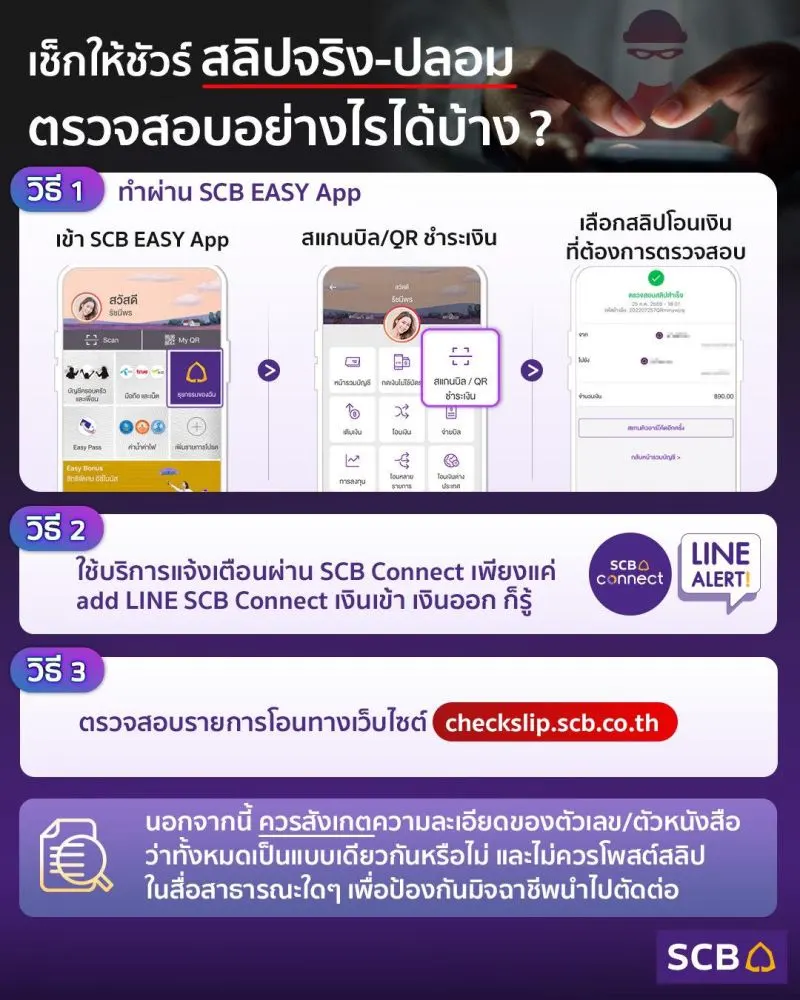 นอกจากนี้ ควรสังเกตความละเอียดของตัวเลข/ตัวหนังสือ ว่าทั้งหมดเป็นแบบเดียวกันหรือไม่ และไม่ควรโพสต์สลิปในสื่อสาธารณะใดๆ เพื่อป้องกันมิจฉาชีพนําไปตัดต่อค่ะ