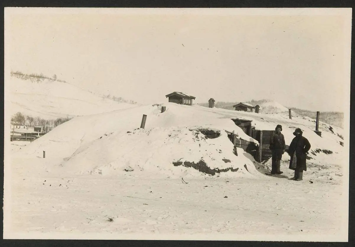 3. ฤดูหนาวในภาคตะวันออกเฉียงเหนืออากาศหนาวจัด หิมะตกหนักปกคลุมทั้งป่า หมู่บ้าน สัตว์และพืชพรรณ กลายเป็นน้ำแข็ง ในภาพ คนสองคนสวมเสื้อโค้ตผ้าฝ้ายหนายืนอยู่ที่ประตูบ้าน จ้องมองกล้องด้วยความมึนงง