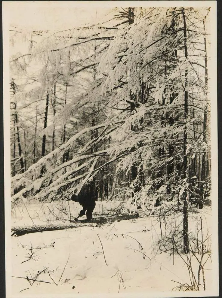 4. ในหิมะ คนกำลังตัดไม้ ภาคตะวันออกเฉียงเหนือมีป่าไม้อุดมสมบูรณ์ คนงานต้องตัดไม้ในอากาศหนาวจัดเพื่อหาเลี้ยงชีพ