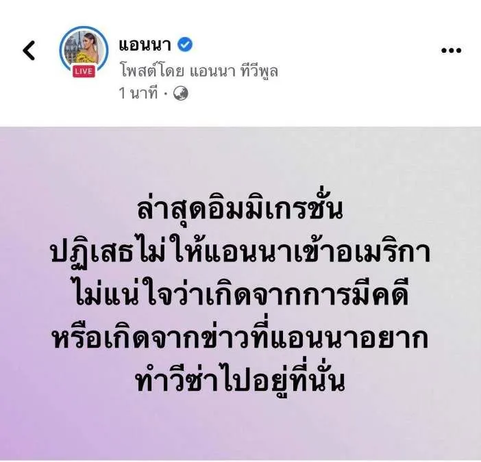 แอนนา เปรมยุดา หรือ แอนนา เน็ตไอดอลชื่อดัง ล่าสุด โพสต์ Facebook ระบุข้อความ“ล่าสุดอิมมิเกรชั่นปฏิเสธไม่ให้แอนนาเข้าอเมริกา ไม่แน่ใจว่าเกิดจากการมีคดี หรือเกิดจากข่าวที่แอนนาอยากทำวีซ่าไปอยู่ที่นั่น”