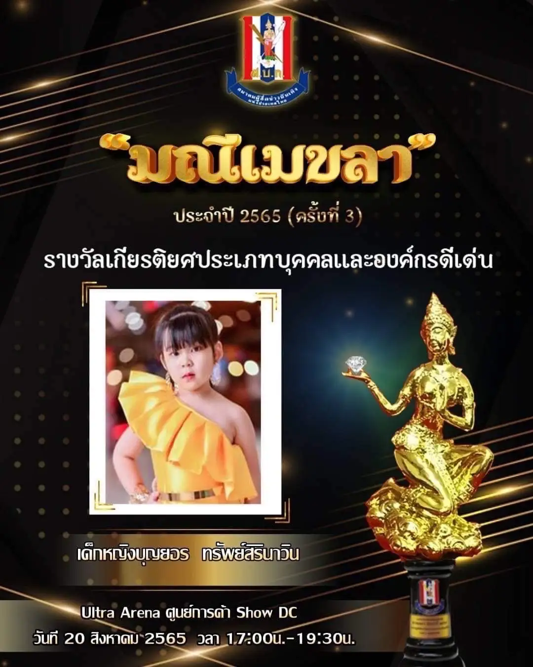 น้องเป๋ยเป้ย ดญ.บุญยอร ทรัพย์สิรินาวิน เข้ารับรางวัลมณีเมขลาครั้งที่ 3 สาขาเยาวชนต้นแบบดีเด่น