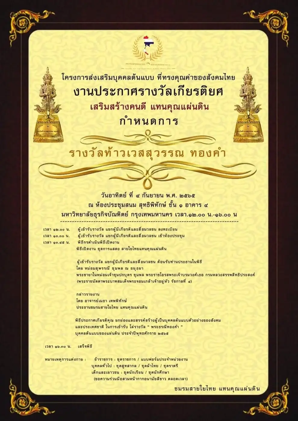เด็กชายปณชล วัฒนมงคล น้องเก้า ได้รับเข้ารับรางวัล “โครงการส่งเสริมบุคคลต้นแบบที่ทรงคุณค่าของสังคมไทย “สาขาฑูตเยาวชน ดีเด่น เมื่อวันอาทิตย์ที่ 4 กันยายน 2565 ณ.มหาวิทยาลัยธุรกิจบัณฑิต อาคารสนม สุทธิพิทักษ์ และยังมีผู้ทรงคุณวุฒิ ศิลปิน และผู้ทำคุณประโยชน์ให้สังคมเข้ารับรางวัลในครั้งนี้ และขอแสดงความยินดีกับทุกท่านด้วยครับ