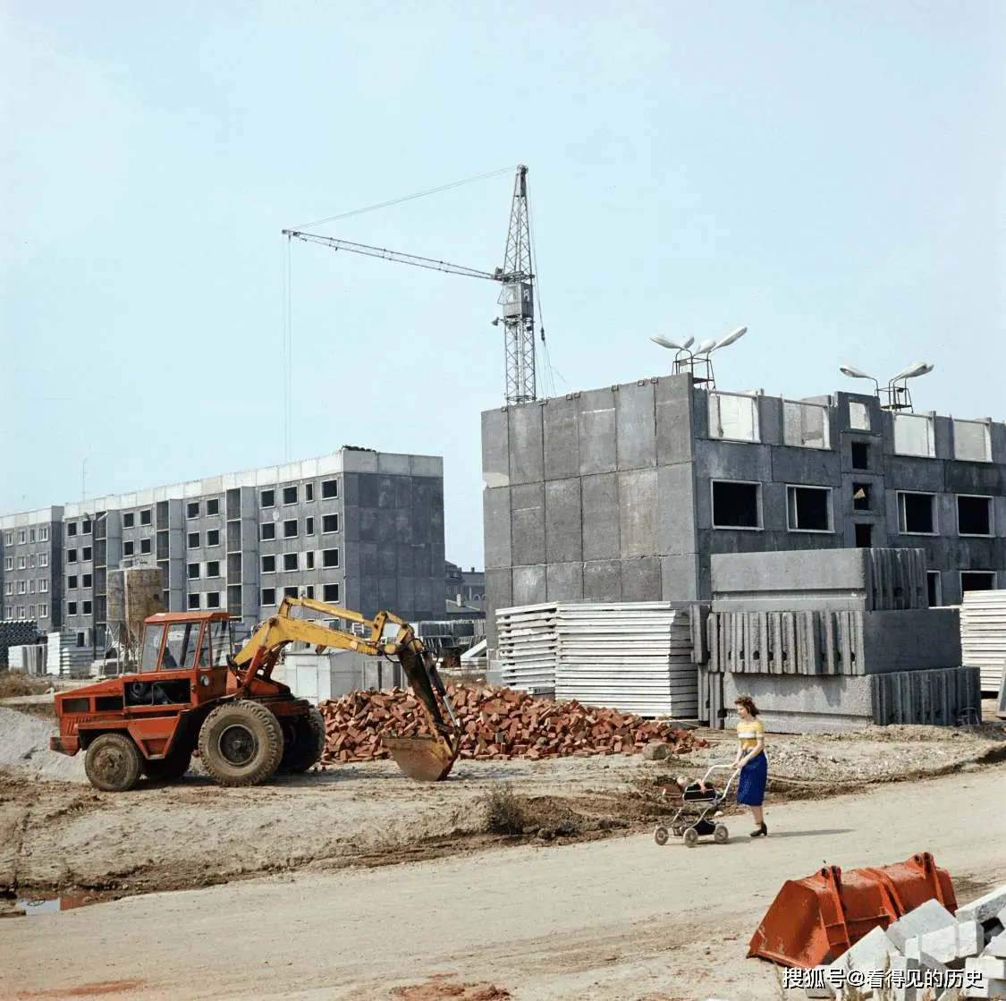 10. ผู้หญิงเข็นรถเข็นผ่านสถานที่ก่อสร้างหน้าอาคารอพาร์ตเมนต์หลังใหม่