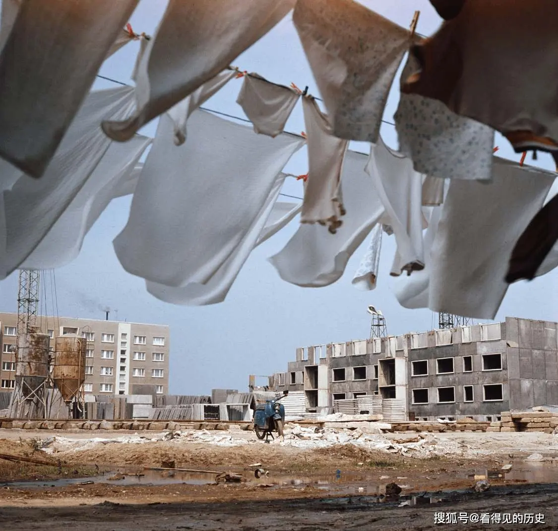 12. ชุดชั้นในของผู้อยู่อาศัยในเขตที่อยู่อาศัยแห่งใหม่นั้นแขวนอยู่บนราวซึ่งดูไม่น่าดู