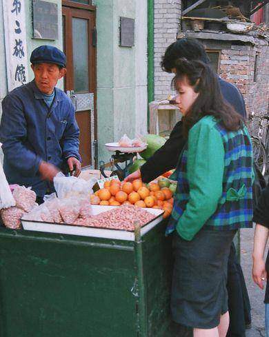3. หน้าโรงแรมในปักกิ่ง ชายชราตั้งแผงขายผลไม้ และคู่สามีภรรยากำลังเลือกผลไม้
