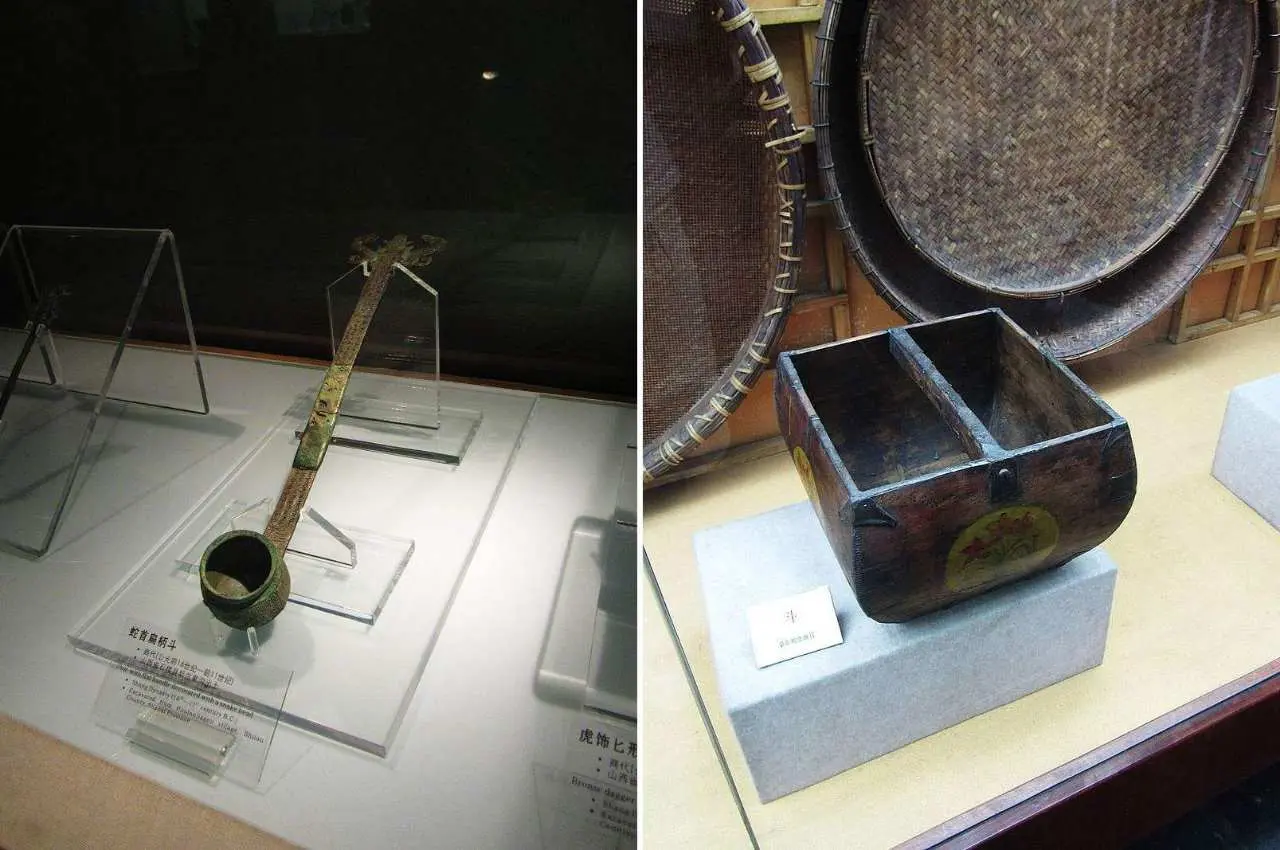 斗 (โต่ว) ที่ถูกขุดค้นพบคือหม้อไฟ ซ้าย: ถังที่ใช้เป็นอุปกรณ์ตักน้ำ (สมัยราชวงศ์ซางและถังด้ามแบน ) ขวา: ถังที่ใช้เป็นเครื่องมือวัด