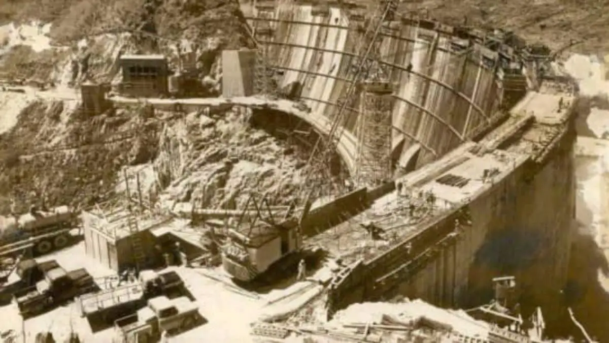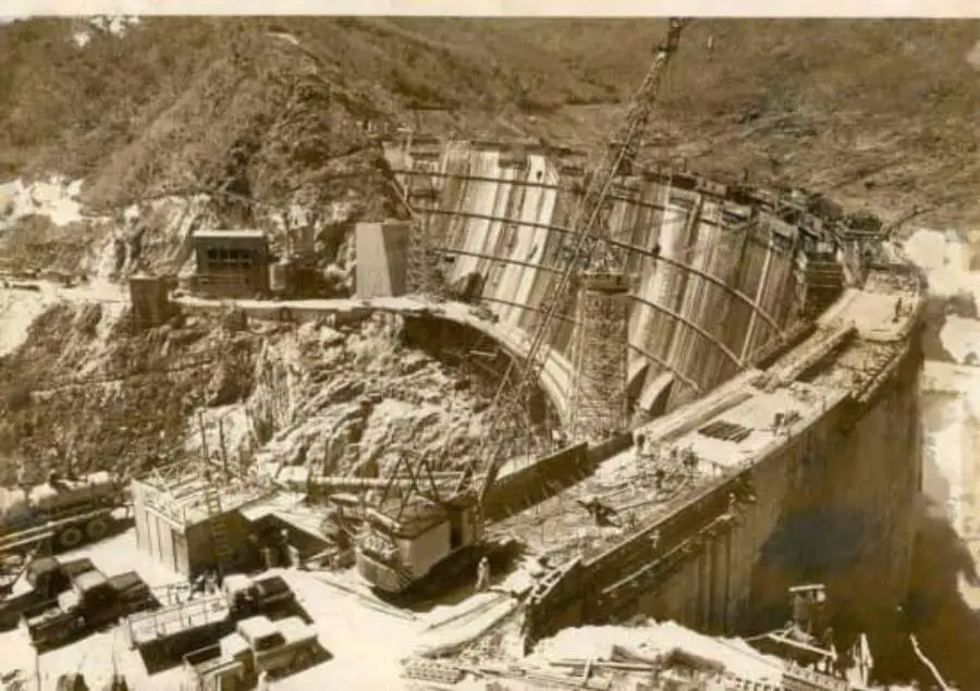 ภาพถ่ายราวๆปี2496เขื่อนภูมิพล เดิมชื่อ เขื่อนยันฮีเป็นเขื่อนคอนกรีตรูปโค้ง รัชกาลที่ 9 เสด็จเปิดในปี2500