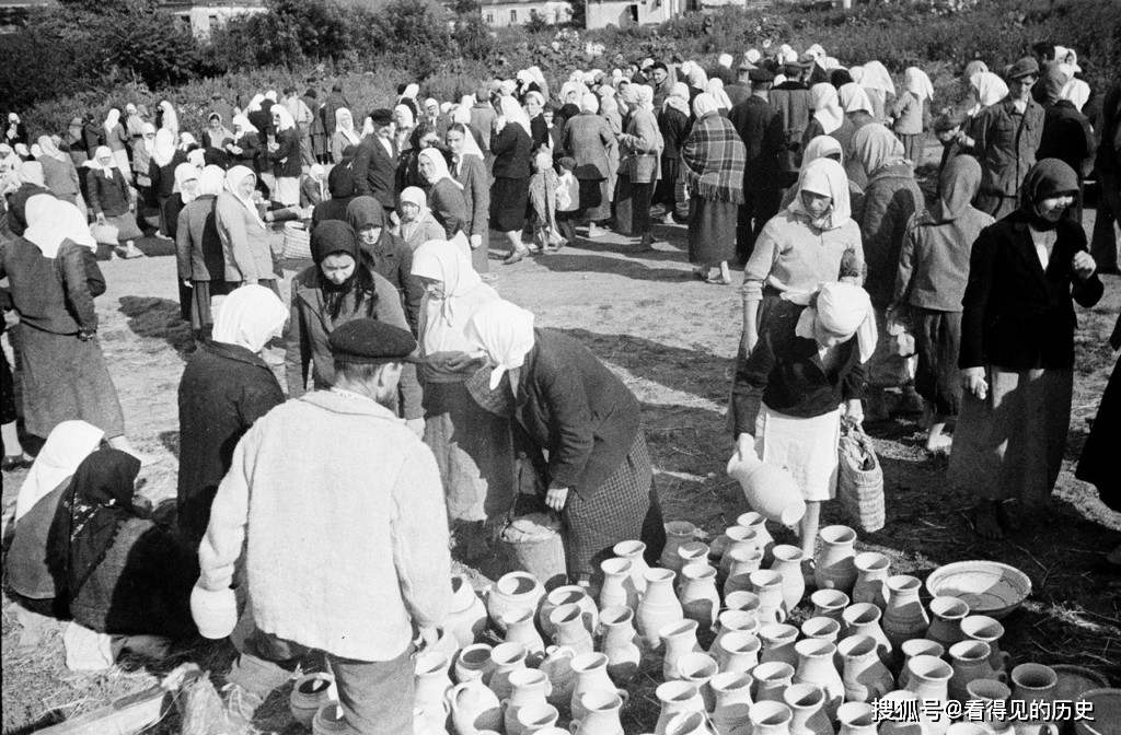 1. ในตลาดชนบทในยูเครนในยุคโซเวียต พ่อค้าแม่ค้าขายหม้อได้ดี ผู้หญิงยูเครนโพกศีรษะด้วยผ้า