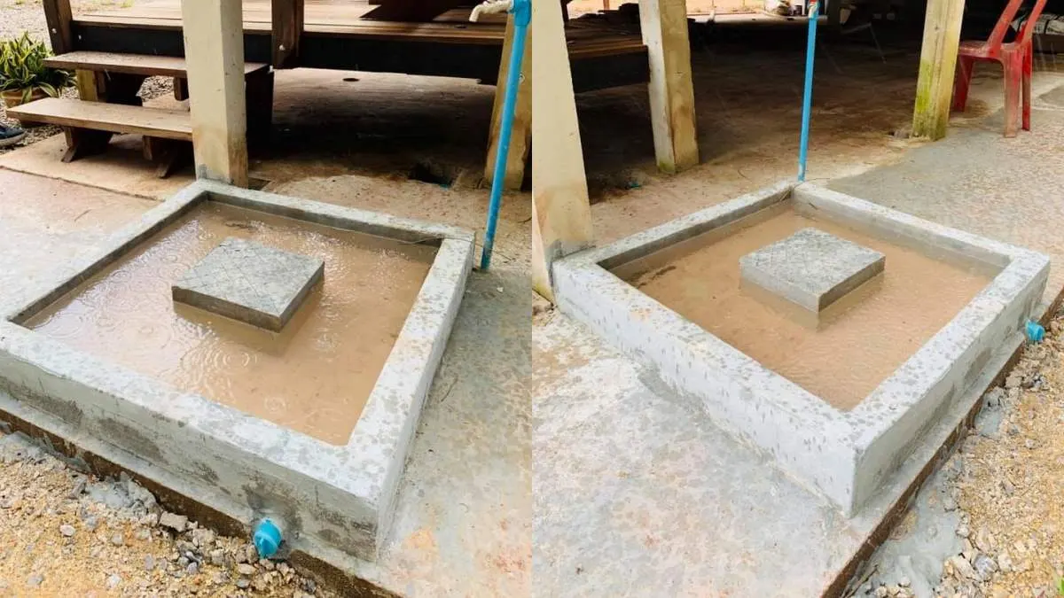 สิ่งนี้เป็น อ่างล้างเท้า บ้านในชนบทแถบลุ่ม ในสมัยก่อนบ้านแต่ละหลัง จะสร้างบ้านแบบใต้ถุนสูง เพราะจะมีน้ำท่วมทุกปีในช่วงฤดูฝน แต่ละบ้านจะมีอ่างล้างเท้าแบบสี่เหลี่ยมทำด้วยปูน ตรงกลางจะมีแท่นสี่เหลี่ยม