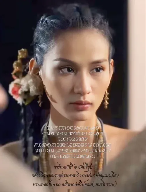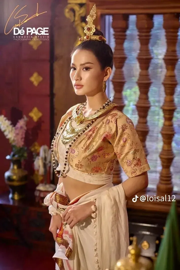 สตรีเพชร เยม ( Yem Srey Pich យ៉ែម ស្រីពេជ្រ ) นักแสดงชาวกัมพูชา ในชุดพระนางสุขรมหาเทวีทรงสมาทานศีลบำเพ็ญพรตฯ ( ในที่นี้ออกพระนามเป็น สังขระมหาเทวี - ស័ង្ខរមហាទេវី ) โดย De PAGE studio ของ Sok Somrach ดีไซเนอร์ชาวกัมพูชา Tiktok บัญชี loisal 12 05 พฤศจิกายน 2568