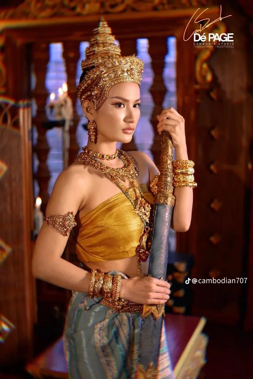 สตรีเพชร เยม ( Yem Srey Pich យ៉ែម ស្រីពេជ្រ ) นักแสดงชาวกัมพูชา ในชุดพระนางสุขรมหาเทวีและพระแสงขรรค์ชัยศรีพระราชทานฯ ( ในที่นี้ออกพระนามเป็น สังขระมหาเทวี - ស័ង្ខរមហាទេវី ) โดย De PAGE studio ของ Sok Somrach ดีไซเนอร์ชาวกัมพูชา