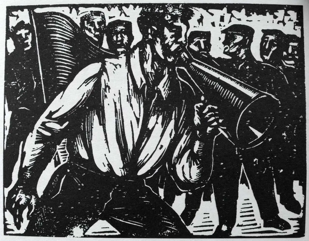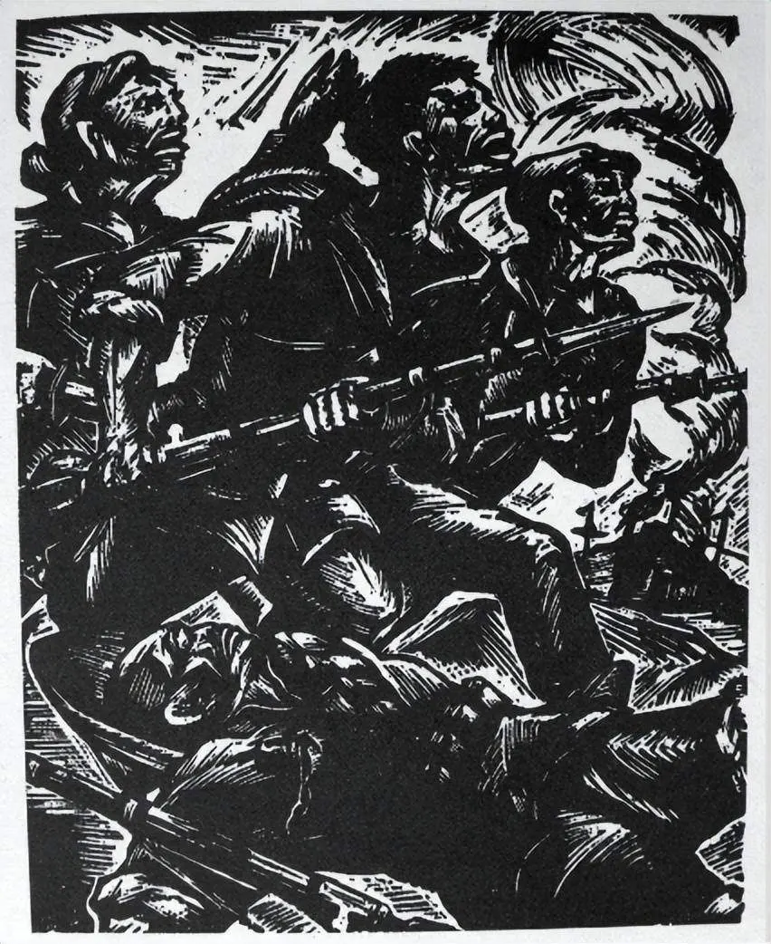 3. ภาพแสดงภาพพิมพ์ไม้ "สามัคคีต่อต้านญี่ปุ่น" ภาพพิมพ์นี้จัดทำโดยคุณ Zhang Changgong ในปี 1938 หรือที่รู้จักกันในชื่อ "Vengeance for the Dead" และได้รับการตีพิมพ์ใน "Wartime Woodcut Bimonthly" ฉบับที่ 8 ในปี 1940 รายได้ภายหลัง "การพิมพ์เจ้อเจียงห้าสิบปี" ในเวลานั้น Zhang Changgong ได้สร้างงานแกะสลักจำนวนมากซึ่งสะท้อนถึงความรอดของชาติที่ต่อต้านญี่ปุ่น ซึ่งเป็นแรงบันดาลใจอย่างมากต่อขวัญกำลังใจในการต่อต้านญี่ปุ่น