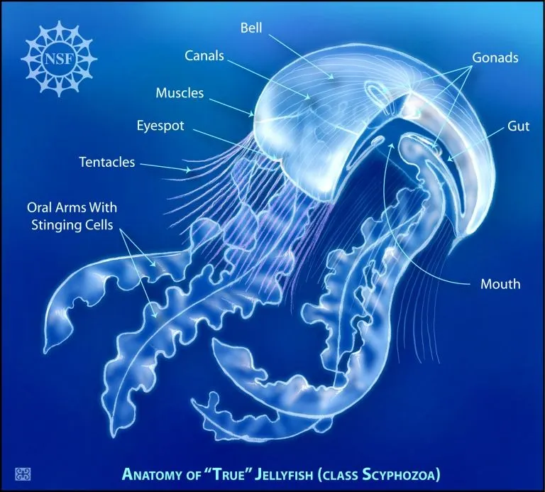 แมงกะพรุน จัดเป็นเเพลงค์ตอนที่มีขนาดใหญ่ที่สุด ไม่มีกระดูกสันหลัง อยู่ในไฟลัม Coelenterate หรือ Cnidalia (ฺBio ก็มา ณ จุด ๆ นี้) ร่างกายมีน้ำเป็นองค์ประกอบถึง 95 % น้องไม่มีสมองนะคะ แต่มีระบบประสาทค่ะ โดยเส้นประสาทจะสานต่อกันเป็นร่างแหไปตามลำตัวตลอดจนถึงหนวด เพื่อทำหน้าที่รับสิ่งเร้าหรือสัมผัสที่มากระทบมัน และตอบสนองกลับโดยการยืด-หดกล้ามเนื้อด้านในและด้านนอกสลับกัน