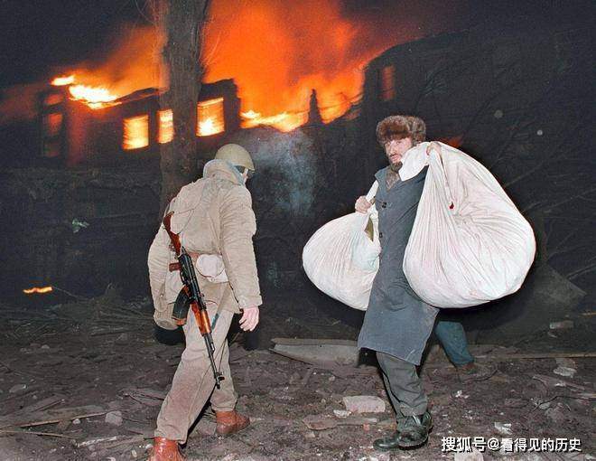1. เมื่อวันที่ 22 ธันวาคม พ.ศ. 2537 หน้าอาคารที่ไฟไหม้ในเมืองกรอซนีย์ เมืองหลวงของเชชเนีย กลุ่มกบฏชาวเชเชนถือ AK47 และชาวเชเชนหลบหนีพร้อมกระเป๋าเดินทาง ภาพถ่ายโดย AFP Alexander Nemenov