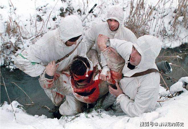 2. ทหารเชเชนพาสหายที่บาดเจ็บออกจากลำธารในกรอซนีย์ 24 ธันวาคม 2537