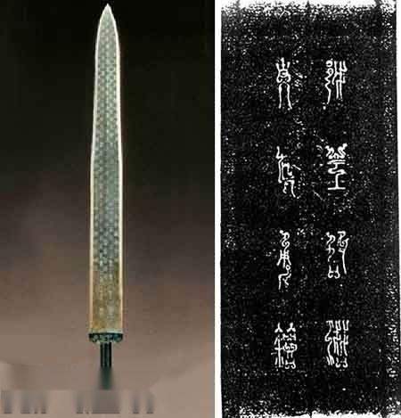 ดาบของ Goujian สลักด้วยอักขระแปดตัว "Jiuqian ราชาแห่ง Yue ผู้ใช้ 鐱" ในตอนต้น ในที่นี้ Jiuqian หมายถึง Goujian และอักขระ 鐱 เป็นอักขระโบราณ แปลว่า ดาบ ความหมายของอักขระทั้งแปดนี้หมายความว่าดาบนี้มีไว้สำหรับ Goujian เอง