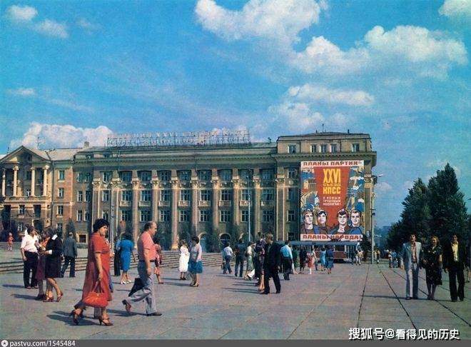 3. ในปี 1980 จัตุรัสเลนินในโดเนตสค์ ประเทศยูเครน โปสเตอร์โฆษณาชวนเชื่อขนาดใหญ่
