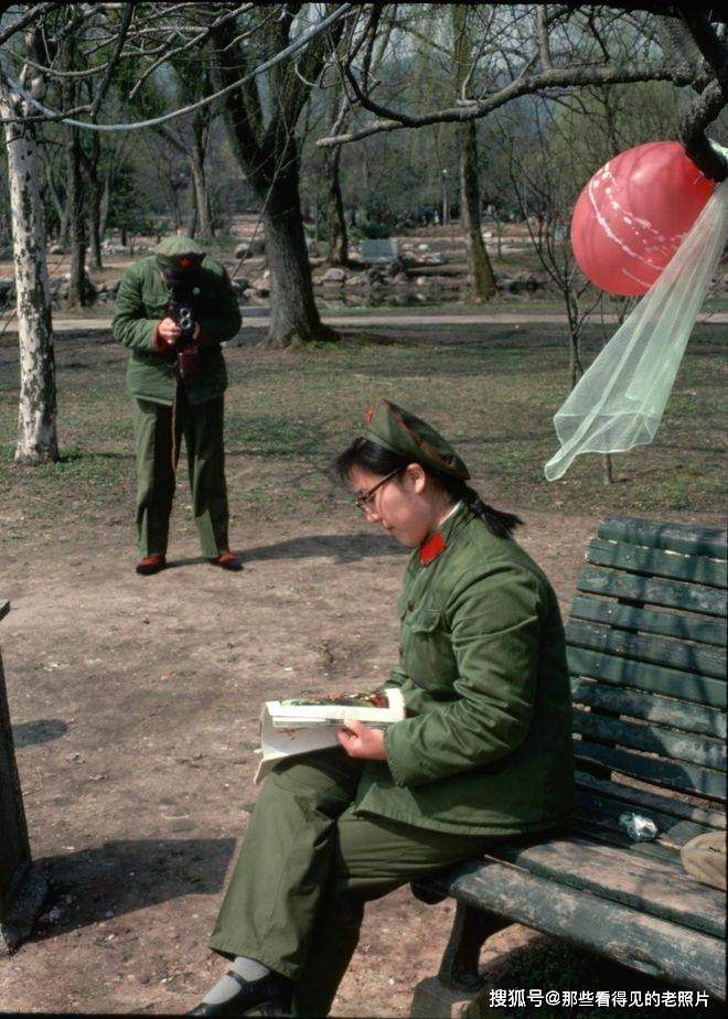 5. บนม้านั่งข้าง West Lake ทหารหญิงของ PLA กำลังนั่งอ่านหนังสือตัวตรง ในขณะที่ทหาร PLA อีกคนกำลังถ่ายรูปเธอ บางทีพวกเขาอาจจะเป็นคู่รักกัน