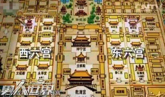 พระราชวังสิบสองแห่งทางตะวันออกและตะวันตกเป็นที่ตั้งของฮาเร็มของจักรพรรดิซึ่งนางสนมอาศัยอยู่ ตำหนักหกแห่งทางตะวันตกที่อ้างถึงส่วนใหญ่หมายถึงตำหนักทั้งหก ได้แก่ ตำหนัก Yongshou, ตำหนัก Yikun, ตำหนัก Chuxiu, ตำหนัก Xianfu, ตำหนักฉางชุน และตำหนัก Qixiang ในขณะที่ตำหนักหกแห่งตะวันออก ได้แก่ ตำหนัก Jingren, ตำหนัก Chengqian, ตำหนัก Zhongcui, ตำหนัก Jingyang, วังหย่งเหอและวังหยานซี