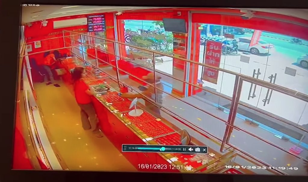 คนร้ายทำทีเป็นลอง ๆ เลือก ๆ 1 บาท บ้าง 2 บาทบ้าง และนาทีเผลอก็ฉกทอง 2 บาทวิ่งไปเลย ช่วงที่คนร้ายกำลังจะคร่อมมอเตอร์ไซต์ พนักงานสาวและเพื่อนก็รีบวิ่งตามไปติดๆ และเธอก็กระโดดถีบยอดอกคนร้ายล้มไปเลยจ้า (เจ้าของร้านทองถูกใจสิ่งนี้ 5555) ก่อนจะจับคนร้ายได้และควบคุมตัวส่งตำรวจ ทราบภายหลังว่าคนร้ายคือครูประถมโรงเรียนเอกชนใน จ. ร้อยเอ็ดนั่นแหละ (ครูอยากเปลี่ยนอาชีพซะงั้น)