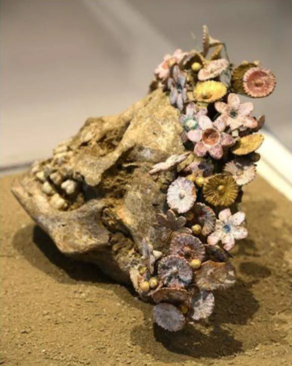 กะโหลกผู้หญิง ยุคกรีกโบราณ ที่มีมงกุฎดอกไม้หลากสี