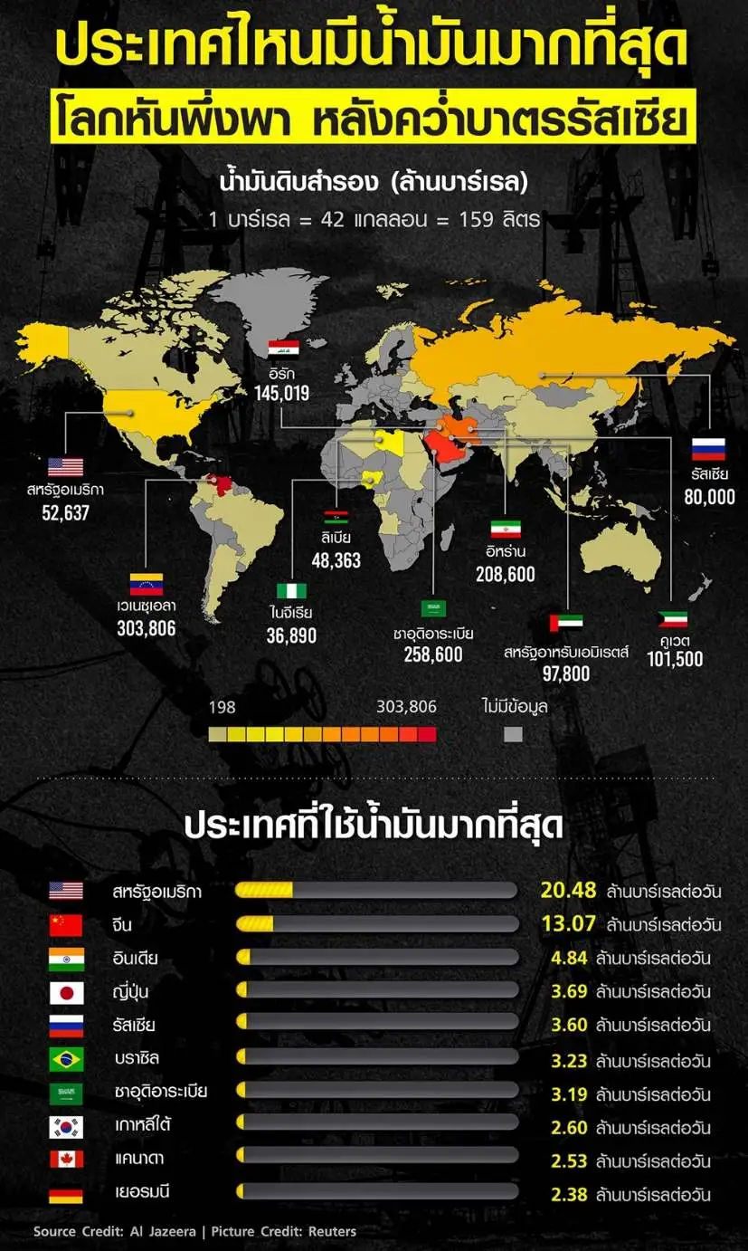 ถ้านับปริมาณน้ำมันดิบสำรอง เวเนซุเอลา ถือว่ามีน้ำมันมากที่สุด ที่ 303,806 ล้านบาร์เรล รองลงมาคือ ซาอุดีอาระเบีย อิหร่าน และคูเวต ส่วนรัสเซีย ซึ่งเผชิญการแบนนำเข้าน้ำมันจากชาติตะวันตก มีน้ำมันสำรองอยู่ที่ 80,000 ล้านบาร์เรล