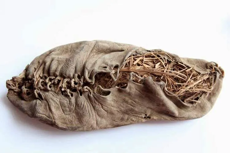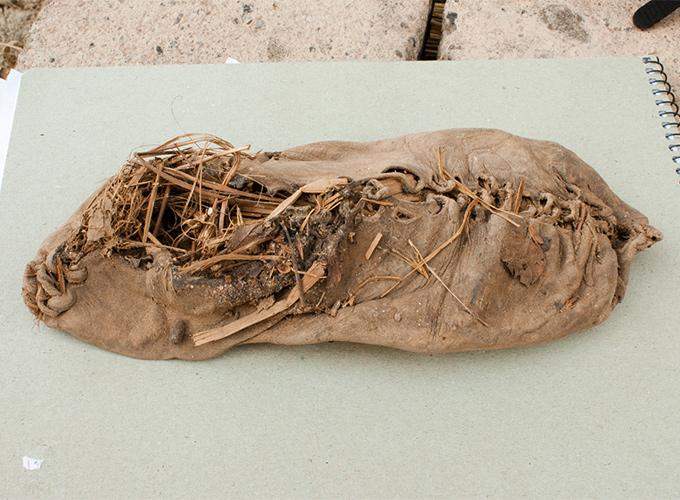 โดยรองเท้าที่ขุดพบนี้เป็นรองเท้าข้างขวา ทำด้วยหนังแท้ ขนาดประมาณเท้าผู้หญิงเบอร์ 4 แต่นักโบราณคดีเชื่อว่าน่าจะเป็นรองเท้าผู้ชายในสมัยนั้น ซึ่งสิ่งที่ทำให้รองเท้าข้างนี้ยังคงไม่ย่อยสลาย คือสภาพอากาศภายในถ้ำที่ค่อนข้างแห้งนั่นเอง